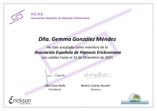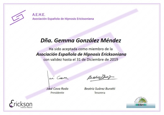 Miembro de la Asociación Española de Hipnosis Ericksoniana.