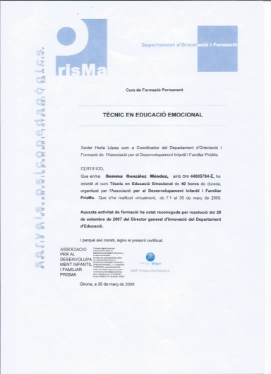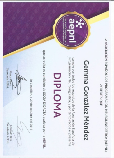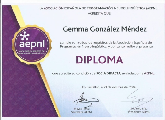Socio didacta y evaluadora de aspirantes a didacta por la Asociación Española de programación Neurolingüística (AEPNL).