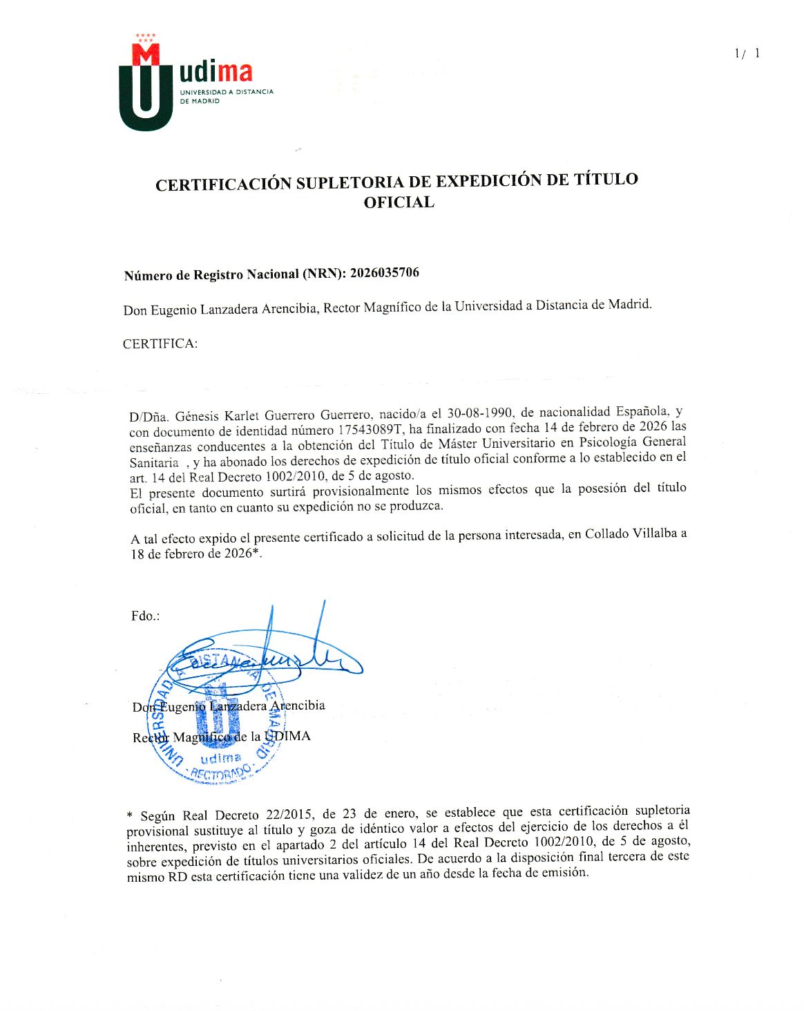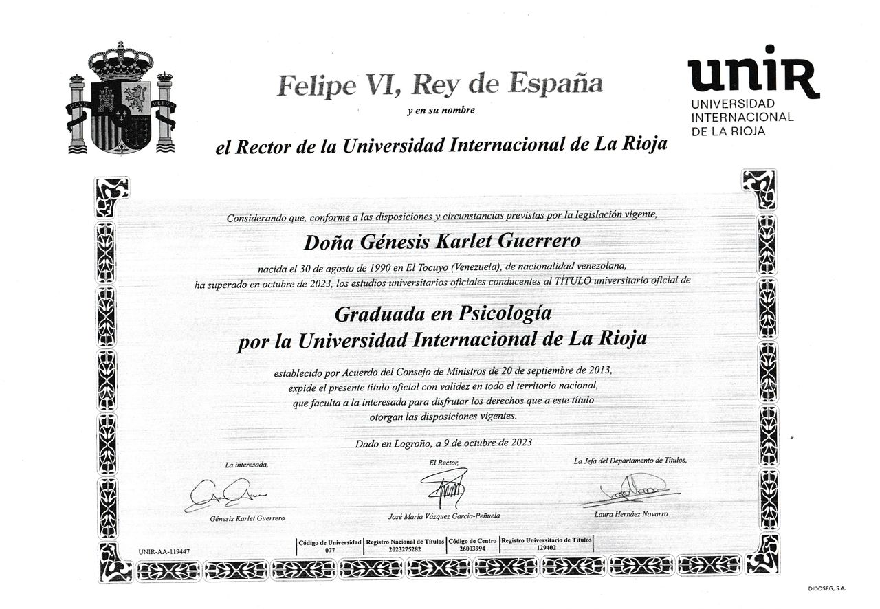 Me gradué con honores en Psicología en la Universidad Centroccidental Lisandro Alvarado (UCLA), en Venezuela, en 2014. Posteriormente, convalidé mi formación en España, donde obtuve el Grado en Psicología con mención en Psicología de la Salud por la UNIR y el Máster en Psicología General Sanitaria por la UDIMA.
