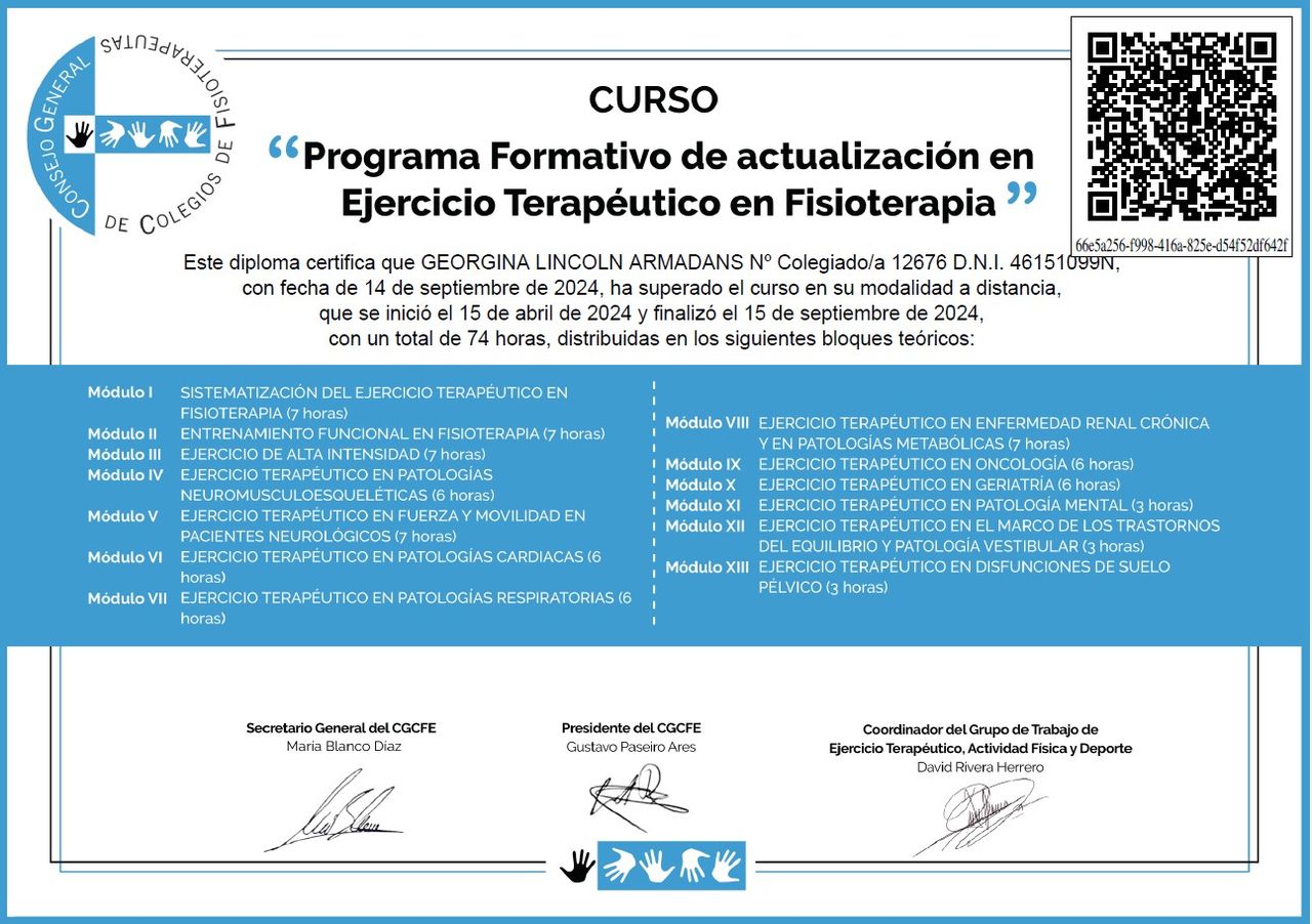 ¿Cuáles son las principales especialidades de Georgina Lincoln Armadans?Georgina Lincoln Armadans es fisioterapeuta. Te mostramos algunos de los servicios que ofrece gracias a su trayectoria y amplia experiencia: Visita Fisioterapia, Masaje terapéutico, Masaje deportivo, Drenaje linfático y presoterapia, Ejercicio Terapéutico Individual, Fisioterapia con Indiba (55 min.), Fisioterapia y Neuromodulación, Ejercicio Terapéutico Pauta Individualizada, Punción seca, Rehabilitación domiciliaria.