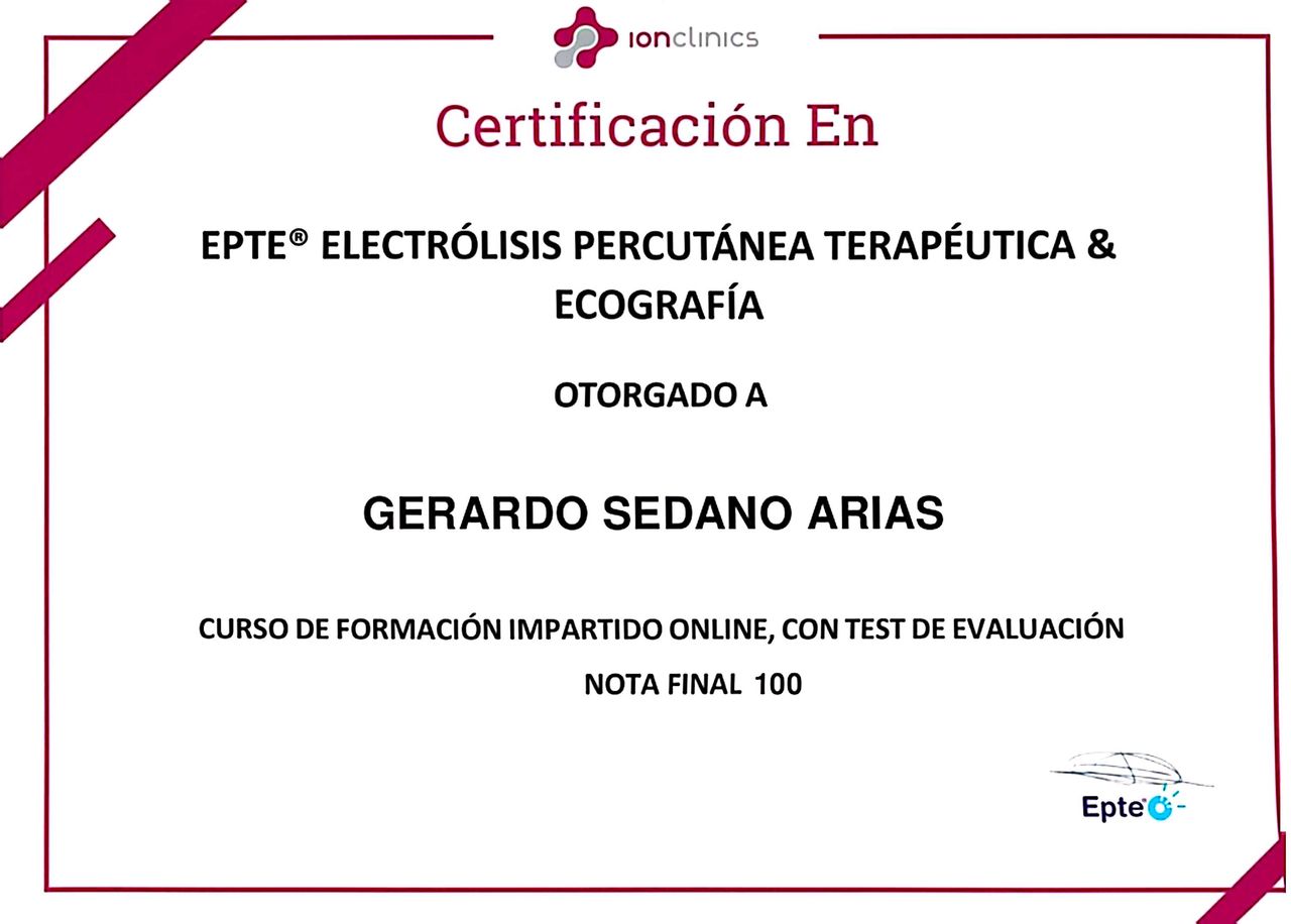 ¿Cuáles son las principales especialidades de Gerardo Sedano Arias?Gerardo Sedano Arias es fisioterapeuta. Te mostramos algunos de los servicios que ofrece gracias a su trayectoria y amplia experiencia: Visita Fisioterapia, Punción seca, Ecografía musculoesquelética, Tratamiento del dolor, Terapia manual ortopédica (TMO), Ejercicio terapéutico, Tratamiento para tendinitis, Rehabilitación del aparato locomotor, Electrólisis Percutánea Terapéutica (EPTE), Tratamiento para el dolor lumbar.