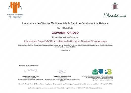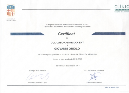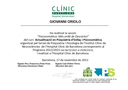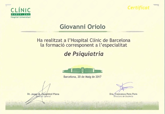 Estas experiencias formativas e investigadoras en ciencias básicas me prepararon para la especialidad de psiquiatría, que realicé via MIR en el Hospital Clínic de Barcelona. En este hospital trabajé 6 años, interesándome primariamente a la psiquiatría de enlace y psicosomática, y desarrollando actividad investigadora que me permitió elaborar una tesis doctoral sobre relaciones entre síntomas mentales, sistema nervioso central y sistema inmunitario (Mood, immunity and brain connectivity in patients with chronic hepatitis C). Realicé colaboraciones con investigadores de diferentes partes del mundo, llegando a publicar diferentes artículos y capítulos de libros, y participando con posters y ponencias en diferentes congresos nacionales e internacionales (Pubmed). También llevé a cabo una estancia de 4 meses en el centro de investigación de psiquiatría translacional de la Universidad de Bordeaux (Nutrineuro), que me permitió adquirir la mención internacional de la tesis.