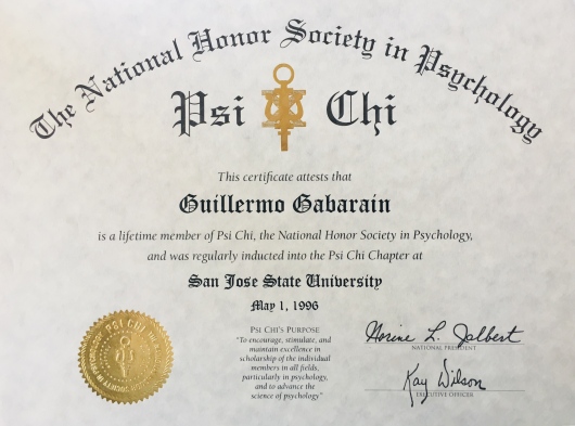 - Licenciatura en San Jose State University (California, EEUU) en Psicología Clínica - Diciembre 1996