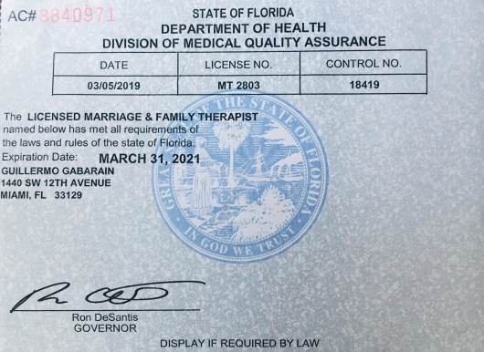 - Licensed Marriage and Family Therapist (Florida Department of Health, USA): MT 2803