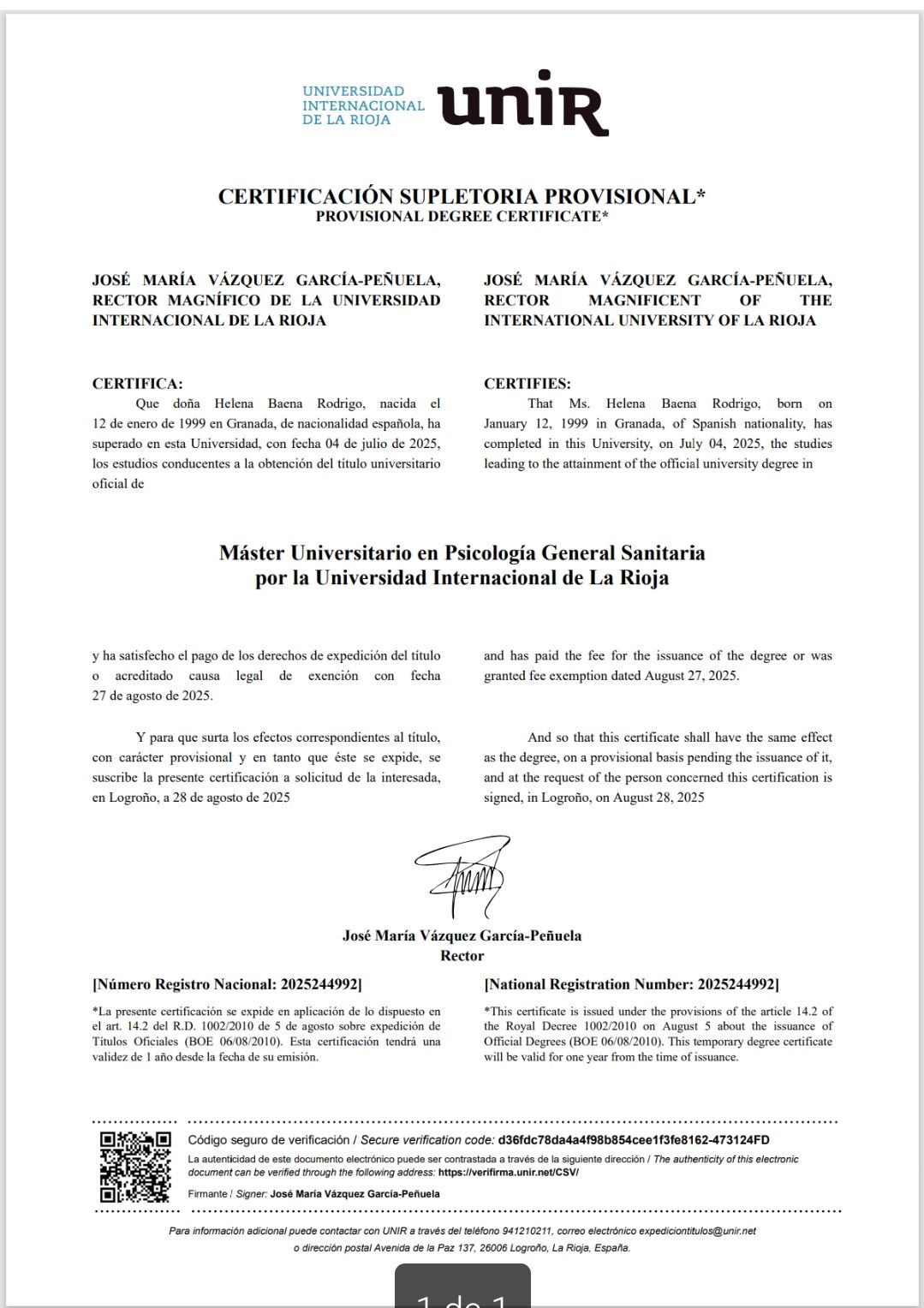 He cursado el Grado en Psicología y el Máster en Psicología General Sanitaria, además de formación especializada en sexología y terapia de pareja. Actualmente ejerzo como psicóloga en el Centro de Psicología Alborán y también ofrezco terapia online, lo que me permite acompañar a personas que viven en distintos lugares.