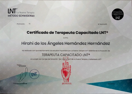 ¿Cuáles son las principales especialidades de Hirahi Hernández?Hirahi Hernández es terapeuta complementaria. Te mostramos algunos de los servicios que ofrece gracias a su trayectoria y amplia experiencia: La Nueva Terapia (LNT), Primera consulta, Consulta informativa, Primera visita acupuntura.
