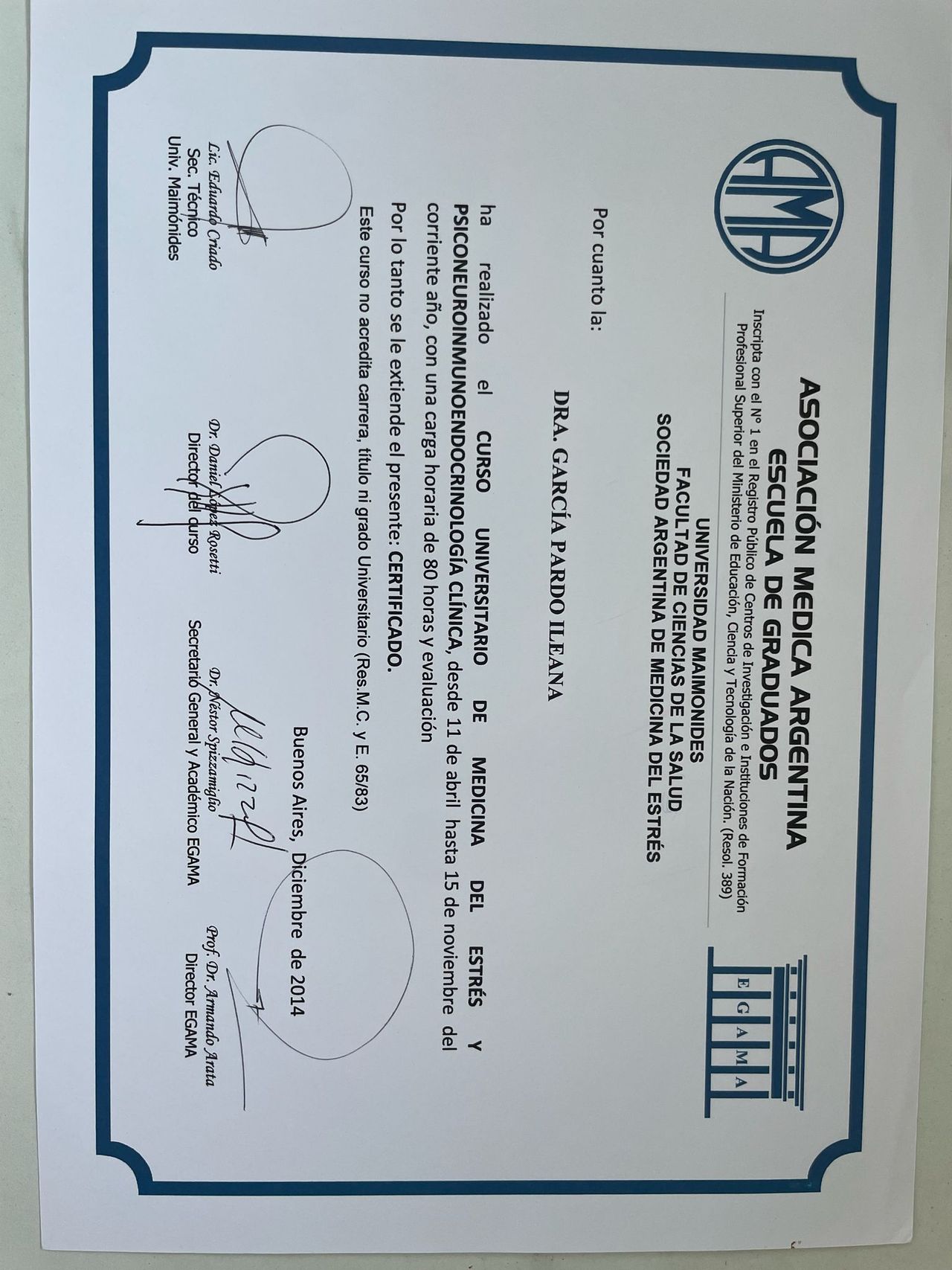 Especialista en Medicina del StressDiploma de honor Universidad del Salvador-Medicinaescucha atenta y respetuosa, la empatía