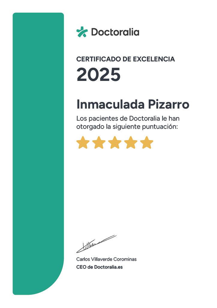 ¿Puedo hacer la visita con Inmaculada Pizarro de forma online, sin tener que desplazarme hasta su consulta?Sí, Inmaculada Pizarro ofrece consulta de forma remota. Solo tienes que seleccionar "consulta online" cuando vayas a reservar cita desde el calendario, y así podrás ver las fechas y horas disponibles.