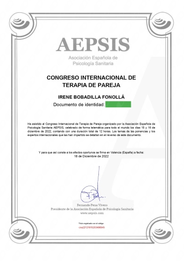 Irene es una gran profesional. Mi pareja y yo estamos muy agradecidos por el proceso terapéutico. Su escucha activa, sus explicaciones claras y las estrategias proporcionadas han reforzado nuestra relación. La recomendamos completamente.
