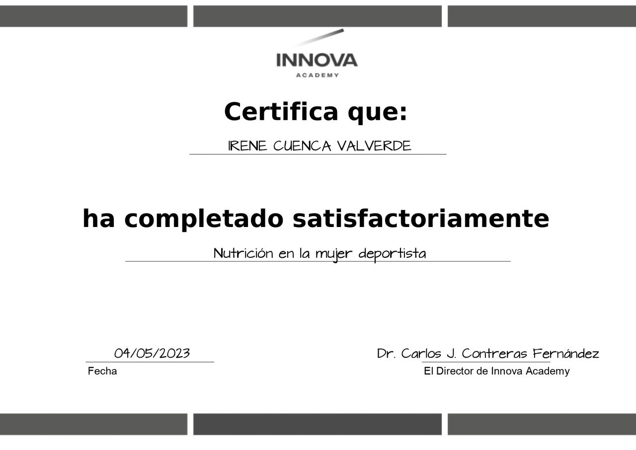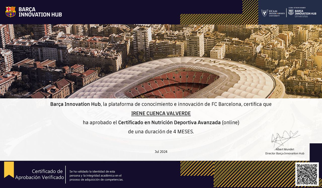 Gracias a sus recomendaciones, he notado una mejora notable en mi rendimiento, energía y recuperación. Además, siempre ha estado disponible para resolver mis dudas y ajustar el plan según mi evolución. Recomiendo a Irene a cualquier persona que busque mejorar su alimentación, ya sea para un reto deportivo o para llevar un estilo de vida más saludable.• Nutricionista Irene Cuenca • Nutrición Online •