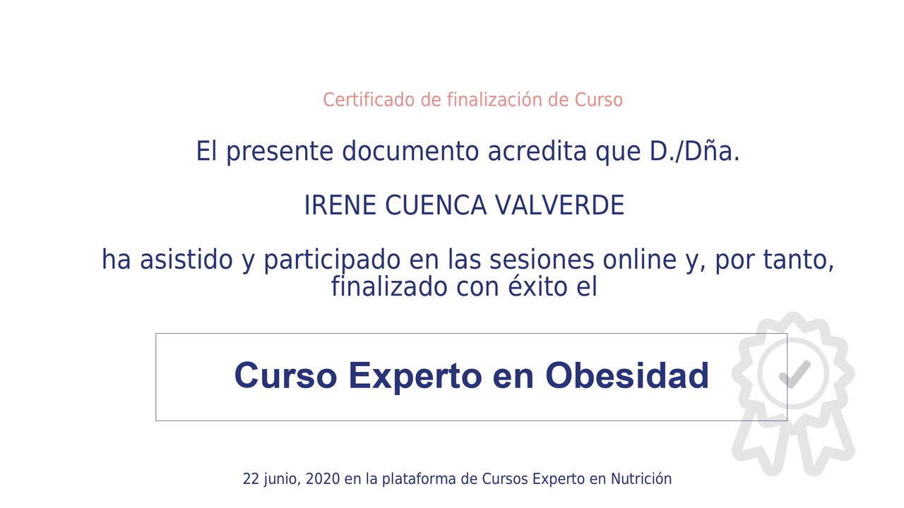 Una gran profesional, la recomendaría sin dudar, muy atenta y pendiente de ti con cualquier duda o problema que te surja. Te entiende y te apoya que es muy importante para mí a la hora de conseguir algo. En resumen, un 10 como profesional y como persona.• Nutricionista Irene Cuenca • Nutrición Online •
