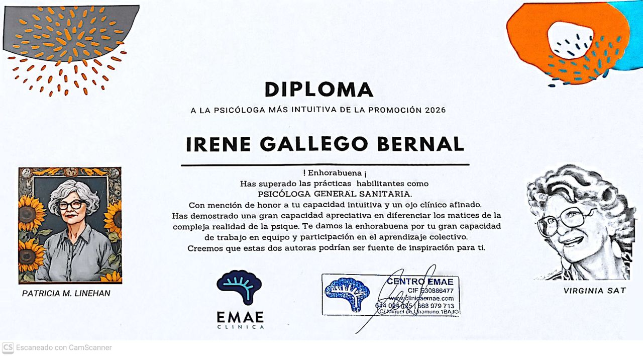 Tuve mi primera sesión con Irene y la verdad es que fue una experiencia excelente. Desde el primer momento me hizo sentir muy cómodo y escuchado, creando un espacio de confianza donde pude hablar sin sentirme juzgado. Se nota que tiene una gran vocación y que le apasiona su trabajo, ya que sabe cómo guiarte y hacerte reflexionar con las palabras justas.