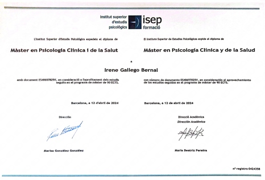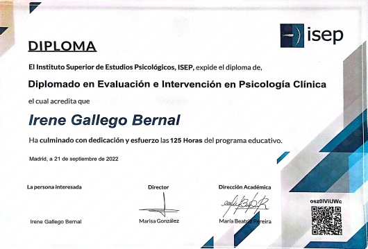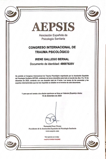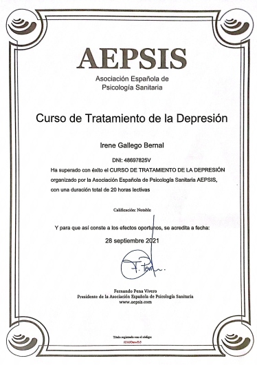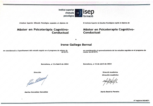 ¿Cuáles son las principales especialidades de Irene Gallego Bernal?Irene Gallego Bernal es psicóloga. Te mostramos algunos de los servicios que ofrece gracias a su trayectoria y amplia experiencia: Primera visita Psicología, Terapia individual, Diagnóstico y tratamiento para trastornos de ansiedad, Reestructuración cognitiva, Psicoterapia, Psicoterapia en adolescentes, Consulta online, Psicoterapia individual, Relajación, Terapia online.