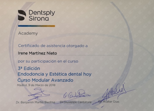 • Curso Modular Avanzado de Endodoncia y Estética dental hoy de Dentsply Sirona de 65h acreditado con 7,2 créditos por la Comisión de Formación Continuada de las Profesiones Sanitarias de la Comunidad de Madrid – Sistema Nacional de Salud.