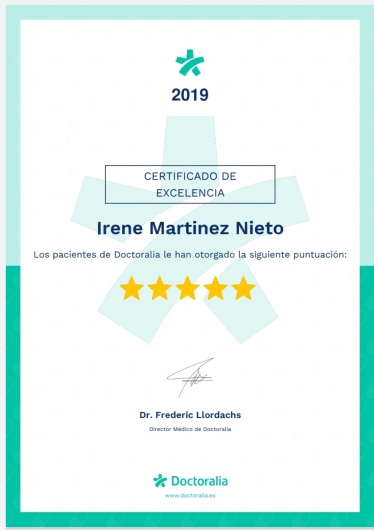 ¿Cómo puedo reservar una cita con Irene Martinez Nieto?El calendario que muestra Irene Martinez Nieto en Doctoralia está actualizado en tiempo real, por lo que solo tienes que elegir qué día y hora te va mejor de entre las disponibles. La reserva es gratuita, y además recibes un recordatorio antes de la visita.