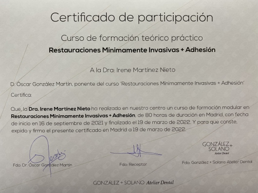 • Módulo 4:Curso “Estudio Gnatológico de caso ortodóncico” de 40 h presenciales y 40 h no presenciales acreditado por la Comisión de Formación Continuada de las Profesiones Sanitarias de la Comunidad de Madrid – Sistema Nacional de Salud.