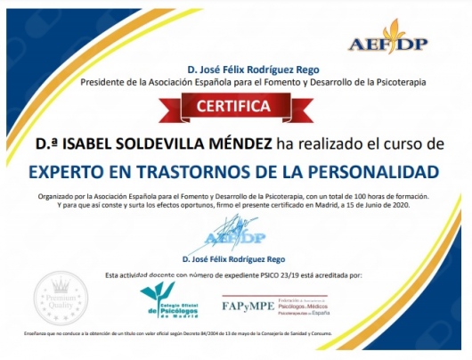 ¿Cuáles son las principales especialidades de Isabel Soldevilla Méndez?Isabel Soldevilla Méndez es psicólogo. Te mostramos algunos de los servicios que ofrece gracias a su trayectoria y amplia experiencia: Orientación en la crianza de los hijos, Técnicas y estrategias de autoestima, Terapia individual, Psicoterapia para adultos adoptados, Psicoterapia para la dependencia emocional, Visitas sucesivas Psicología, Acompañamiento psicológico en el proceso personal, Acompañamiento en el proceso profesional, Asistencia psicológica a mujeres víctimas de violencia de género, Atención a pacientes pluripatológicos.