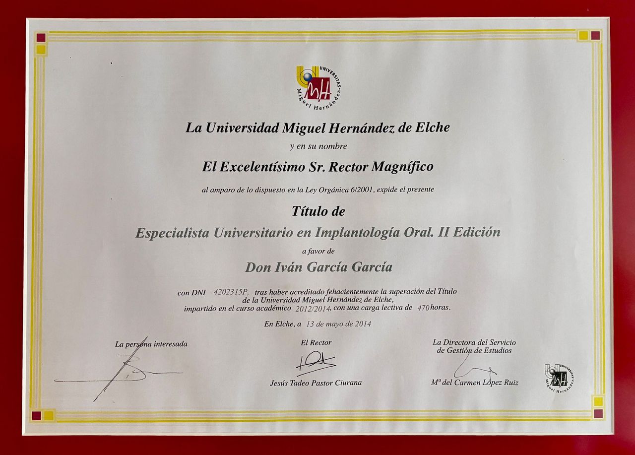Especialista en Implantología Oral por la Universidad Miguel Hernández (UMH), Elche.