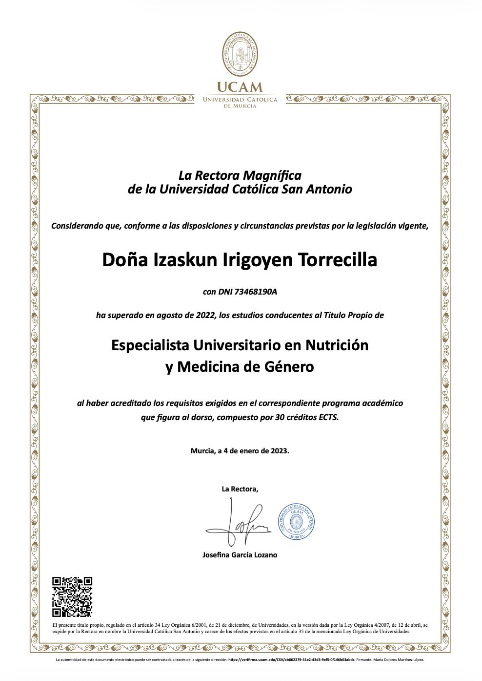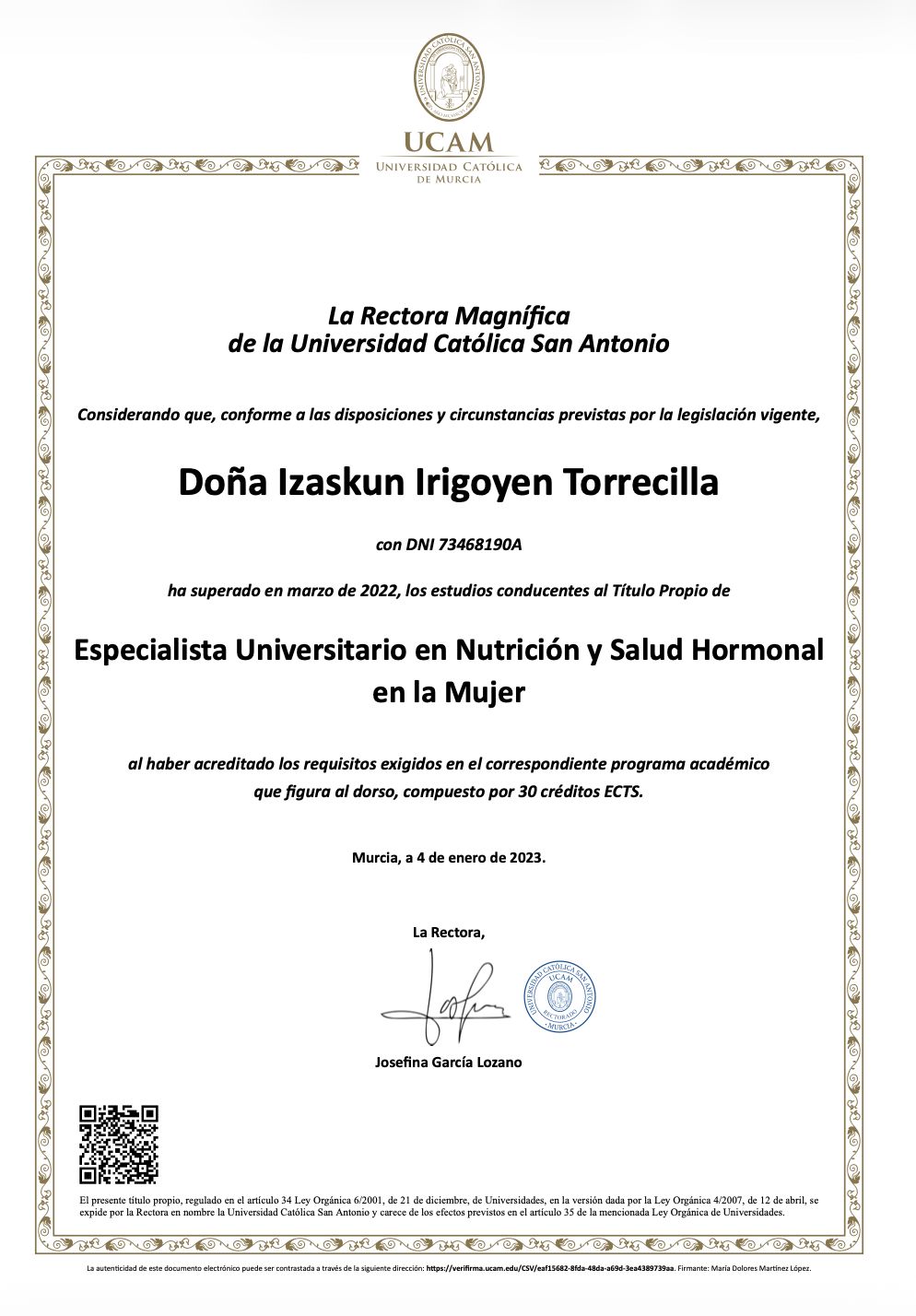 También cuento con especialización tanto en Salud Hormonal y Medicina de Género, como en Obesidad y Trastornos de la Conducta Alimentaria (Universidad Católica de Murcia), lo que me permite abordar cada caso de forma individualizada, basada en la evidencia científica y adaptada a las necesidades reales de cada paciente.