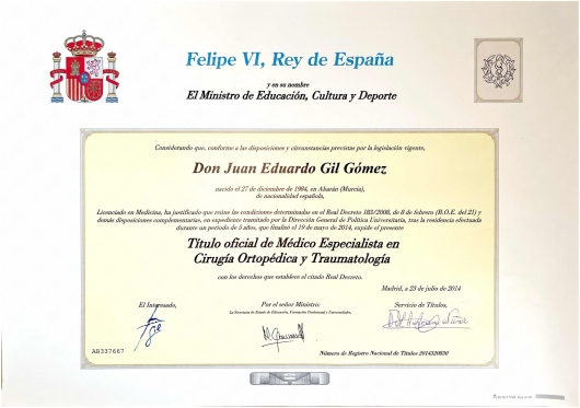 El Dr. Eduardo Gil, Licenciado en Medicina por la Universidad de Murcia, se especializó en Cirugía Ortopédica y Traumatología en el Hospital Morales Meseguer de Murcia, compatibilizándolo con los estudios en el máster en Anatomía Aplicada del Departamento de Anatomía de la Universidad de Murcia.