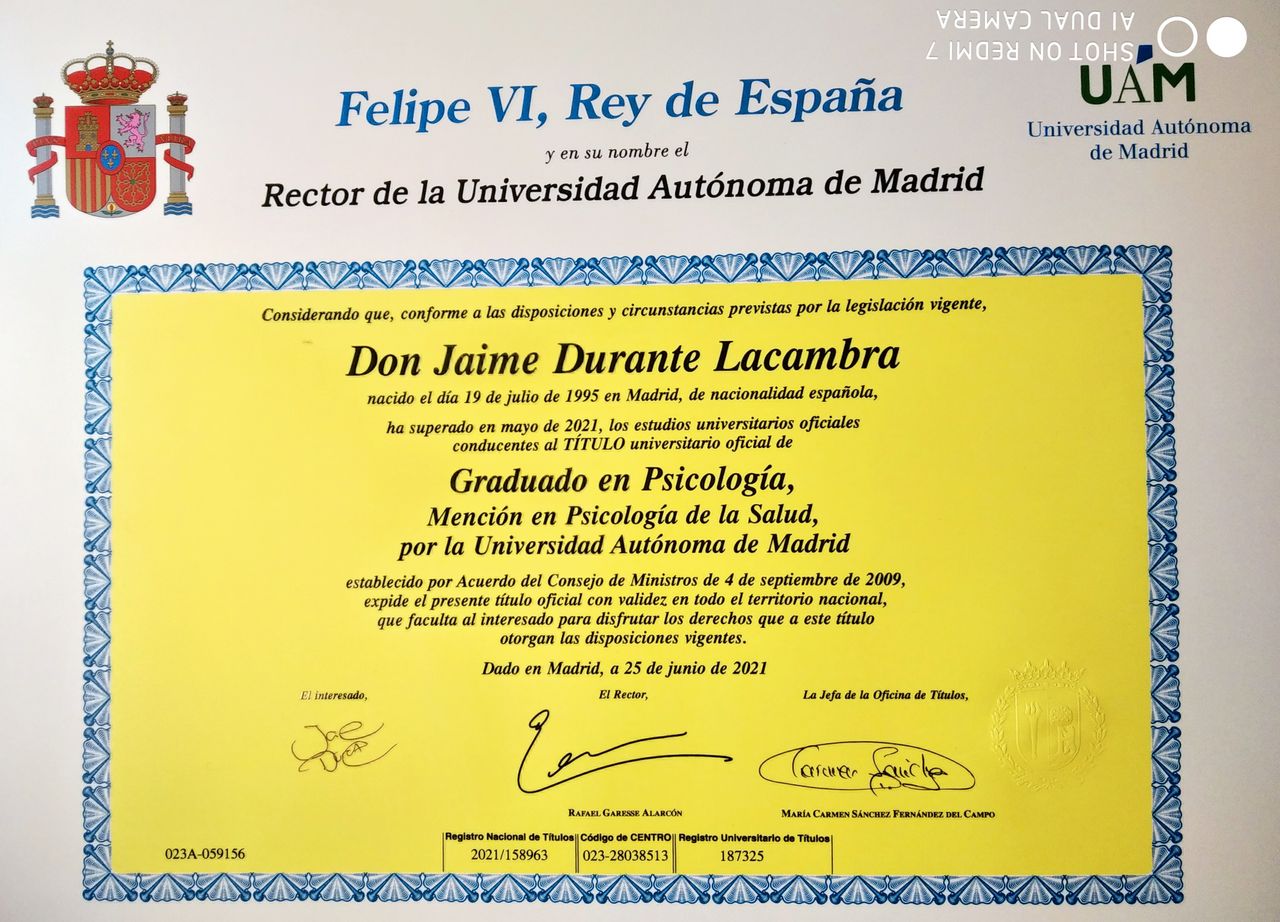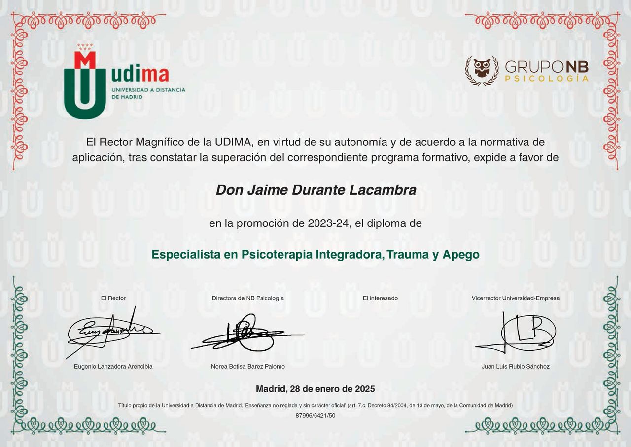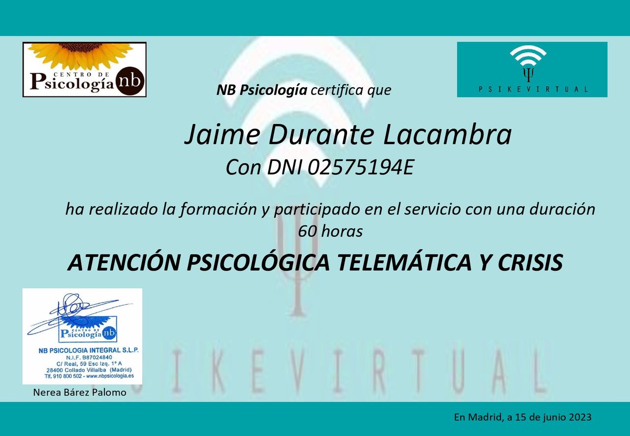 ¿Cuáles son las principales especialidades de Jaime Durante?Jaime Durante es psicólogo. Te mostramos algunos de los servicios que ofrece gracias a su trayectoria y amplia experiencia: Consulta online, Primera visita Psicología, Atencion psicológica para adultos, Atencion psicológica para adolescentes, Consulta de psicología.