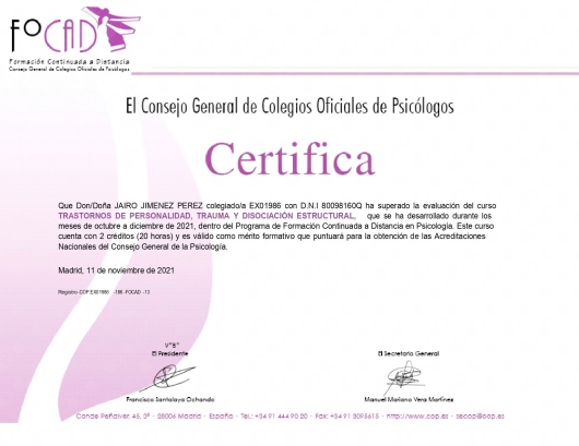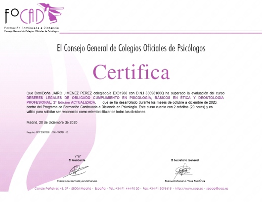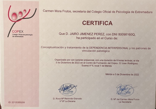 Como psicólogo general sanitario, estoy colegiado en el Colegio Oficial de Psicólogos de Extremadura con el número EX01986.