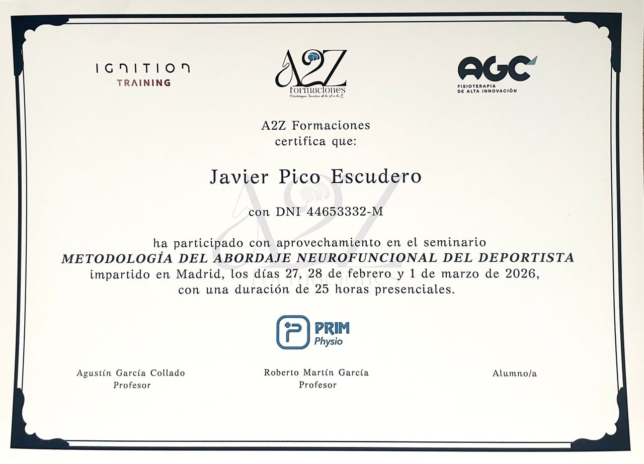 Graduado en Fisioterapia y Ciencias de la Actividad Física y Deporte por la Universidad Europea de Madrid. Experto en Terapia Manual Ortopédica en el Tratamiento del Dolor por la Universidad Europea de Madrid. Experto en ecografía y fisioterapia invasiva, EPI y Neuromodulación Percutanea Funcional.