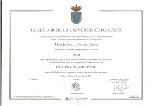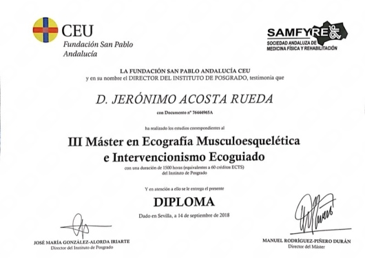 Me formé como Médico Rehabilitador en el Hospital Lozano Blesa de Zaragoza. Tengo un máster en Intervencionismo Ecoguiado por la Universidad de Sevilla, un Experto Universitario del Tratamiento del Dolor por la Universidad de Cádiz y un Experto en Ecografía Músculoesquelética por la Universidad Francisco Vitoria. Además formo parte de la Sociedad Española de Medicina Física y Rehabilitación (SERMEF) y de la Sociedad Andaluza (SAMFYRE).
