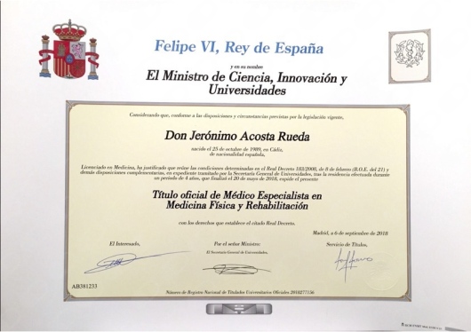 ¿Cuáles son las principales especialidades de Jerónimo Acosta Rueda?Jerónimo Acosta Rueda es médico rehabilitador. Te mostramos algunos de los servicios que ofrece gracias a su trayectoria y amplia experiencia: Consulta de revisión Medicina Física y Rehabilitación, Primera visita Medicina Física y Rehabilitación, Ecografía musculoesquelética, Infiltraciones articulares o periarticulares, Infiltraciones de acido hialurónico en rodilla, Tratamientos con Neurotoxina, Infiltraciones guiadas por ecografía, Prescripción médica del ejercicio, Tratamiento del dolor, Rehabilitación para parálisis cerebral.