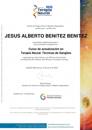 ¿Cuáles son las principales especialidades de Jesus Benitez Benitez?Jesus Benitez Benitez es médico general, médico estético. Te mostramos algunos de los servicios que ofrece gracias a su trayectoria y amplia experiencia: Visita Medicina General, Tratamiento del dolor articular, Tratamiento del dolor, Primera visita informativa gratuita, Tratamiento del dolor de columna, Ozonoterapia, Terapia Neural.