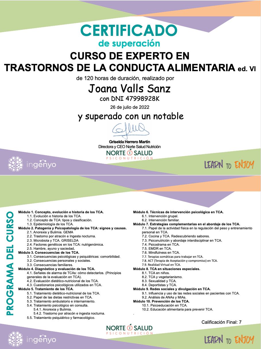 Estoy muy agradecida por el acompañamiento de Joana durante estos meses. Me ha ayudado en la preparación de mi maratón y también en la gestión de mi colitis ulcerosa y del SIBO, siempre desde la empatía, la cercanía y un gran conocimiento profesional. Gracias a su guía he aprendido a adaptar mi alimentación, mejorar mi rendimiento y, sobre todo, a sentirme mejor en mi día a día. Me he sentido escuchada, comprendida y apoyada en todo momento. Sin duda, una profesional totalmente recomendable por su trato humano y su implicación.