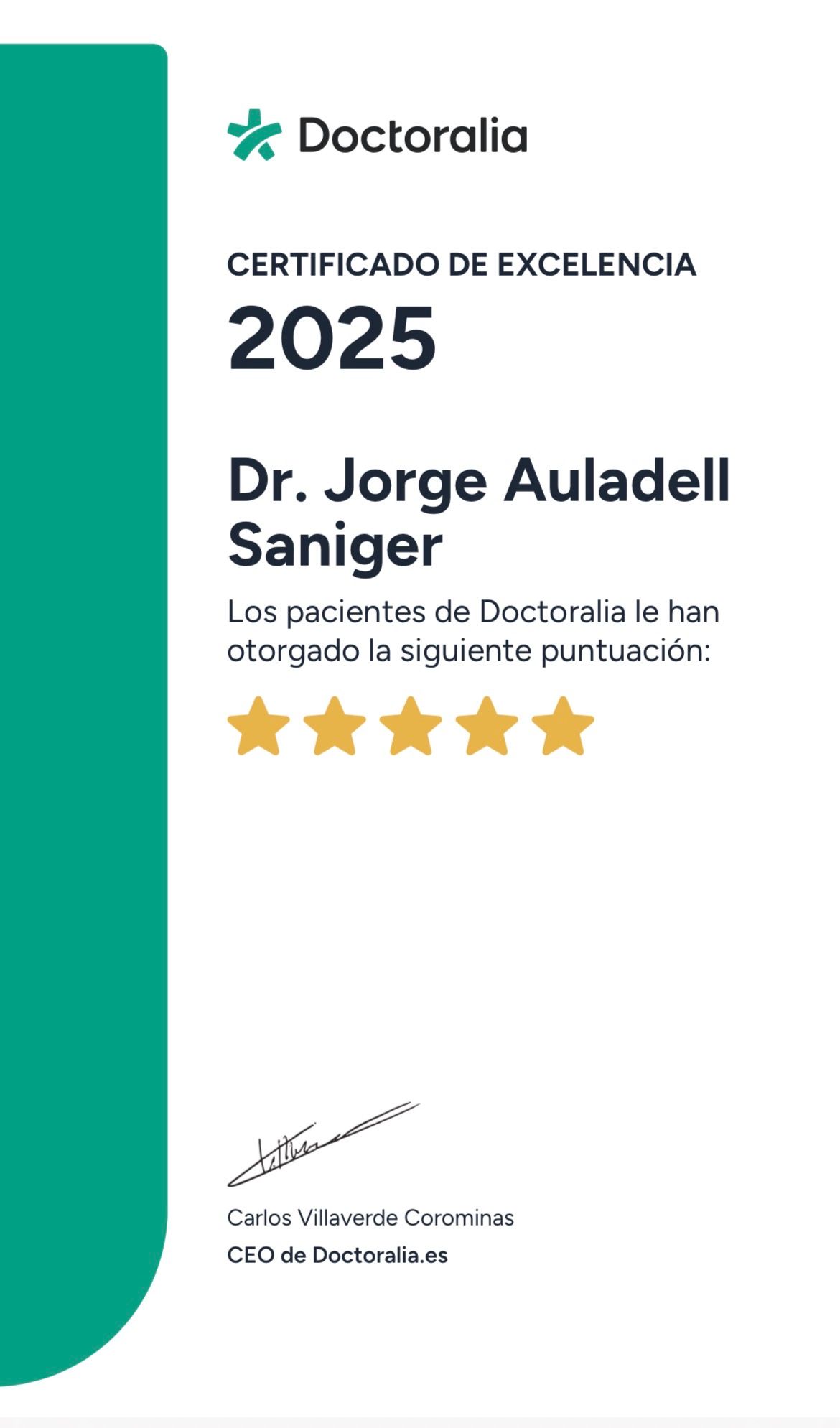Quiero dar las gracias de corazón al Dr. Jorge Auladell por el trato, diagnóstico y tratamiento para mi abuela , gracias a su dedicación, su vida , y también la nuestra ha mejorado muchísimo. Ahora también está tratando a mi pareja, y estamos muy agradecidos por la empatía, la paciencia y la atención con la que lo acompaña en cada sesión.