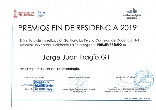 Posteriormente ha continuado trabajando de Reumatólogo en diferentes hospitales, estando actualmente en el Hospital La Fe de Valencia donde lo compagina con actividad investigadora y estudios de Doctorado.