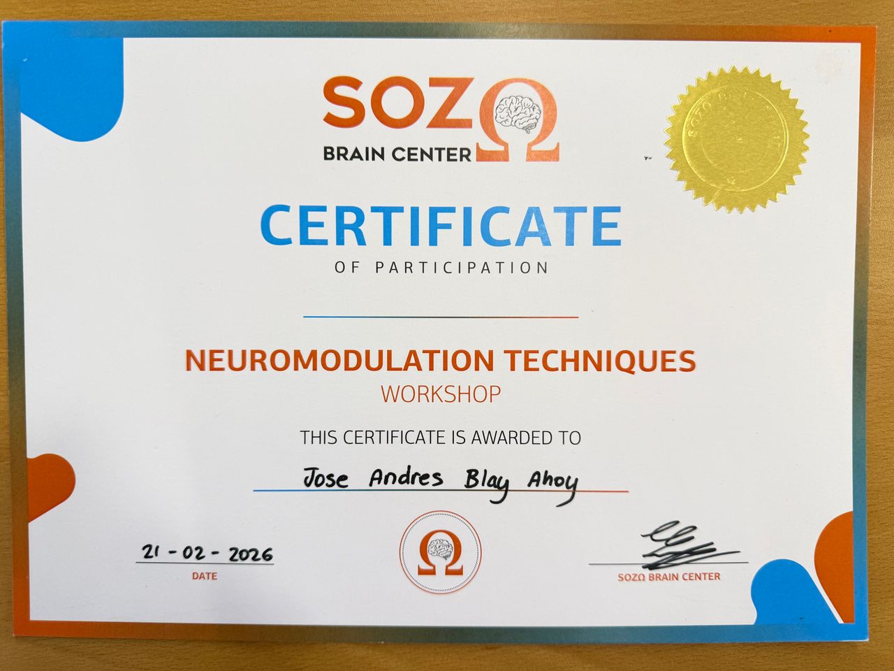 En 2026 he ampliado mi formación en neuromodulación cerebral no invasiva participando en el workshop internacional de técnicas de neuromodulación del SOZO Brain Center, orientado a la regulación del sistema nervioso y la mejora de la función cerebral mediante métodos no invasivos.