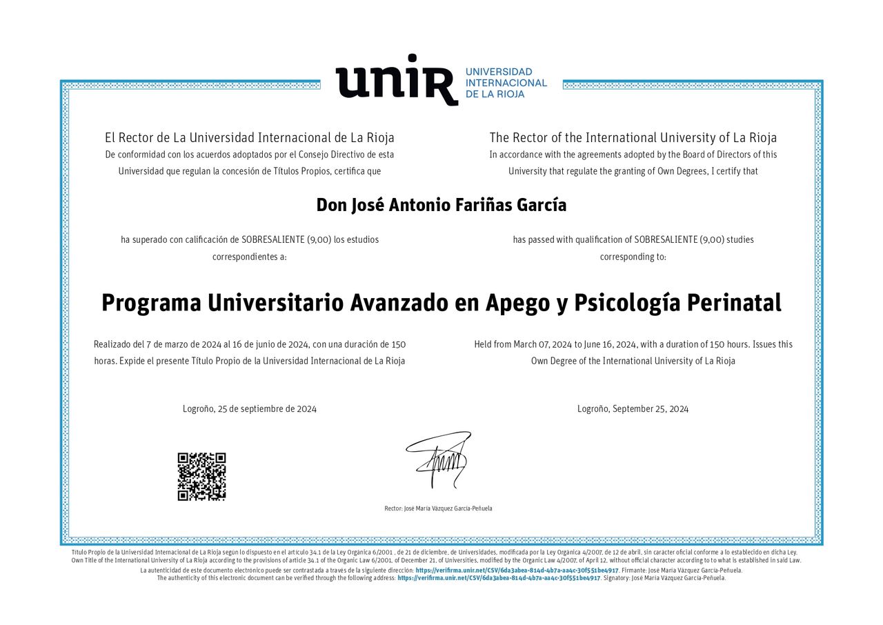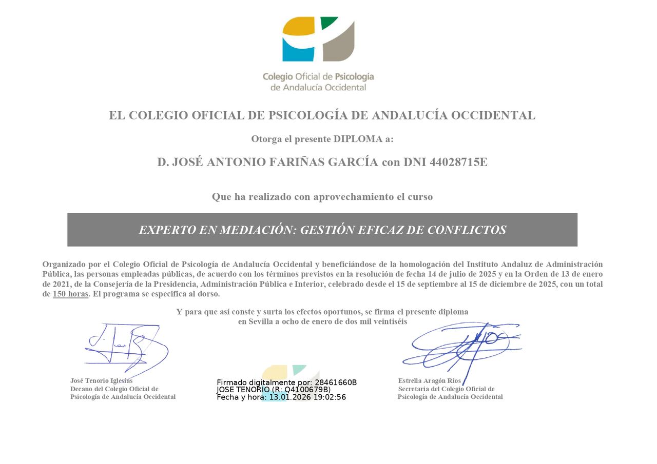 Licenciado por la Universidad de Málaga, tengo formación en psicología humanista, sistémica, apego y psicología perinatal. También estoy acreditado como experto en mediación y gestión de conflictos.