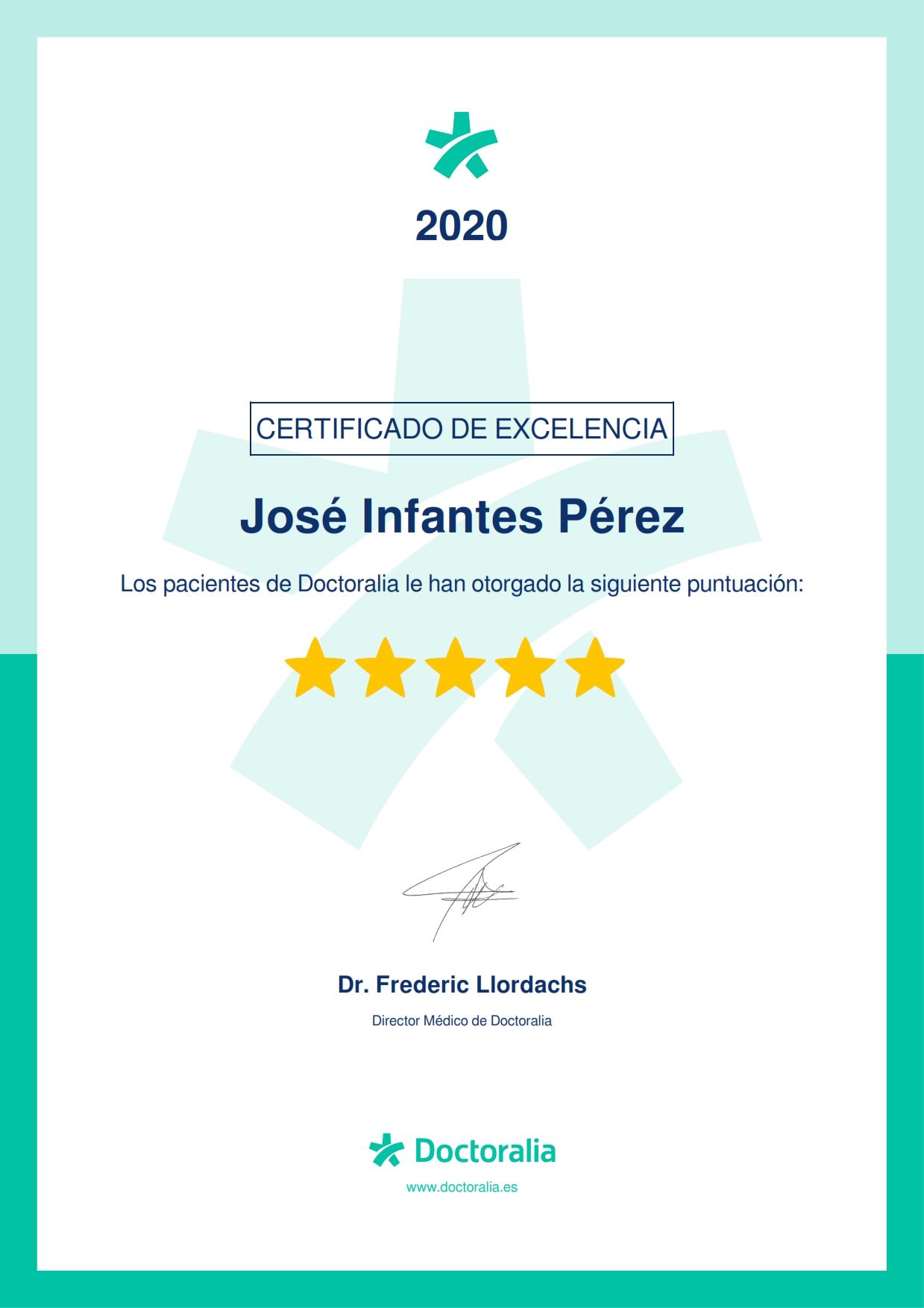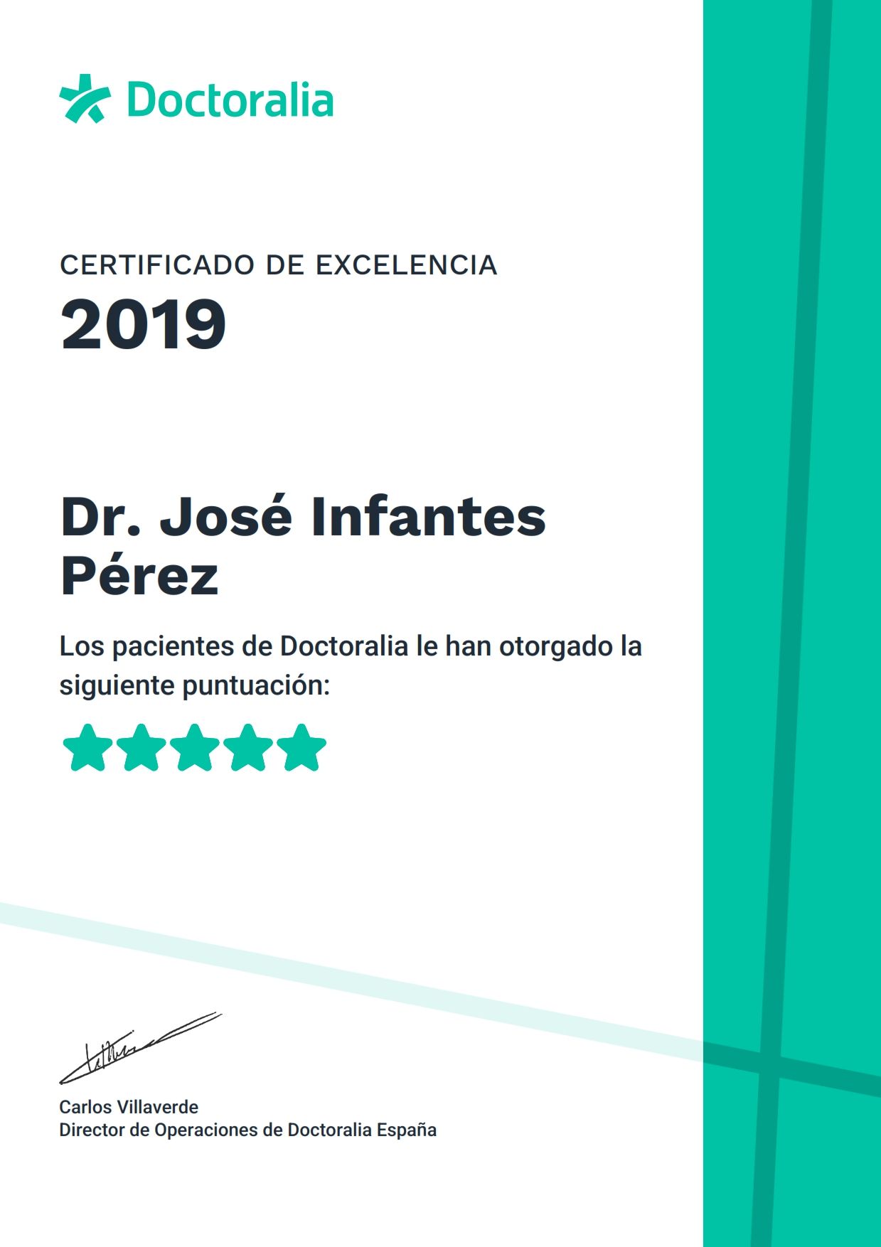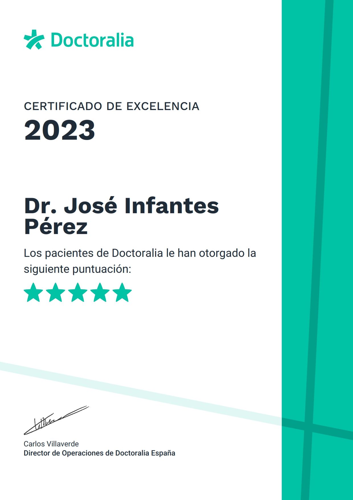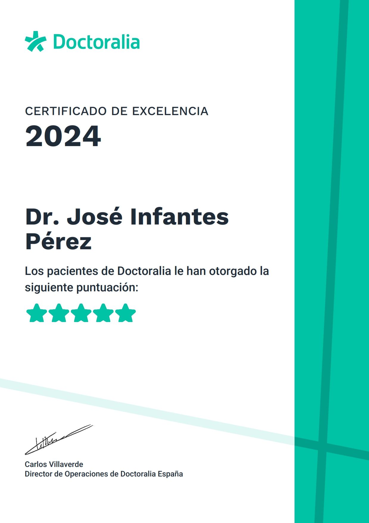 ¿Qué opinan los pacientes de José Infantes Pérez?Un total de 718 pacientes han querido dejar una opinión sincera y real sobre José Infantes Pérez, otorgándole además una valoración media de 5 estrellas (sobre un máximo de 5).