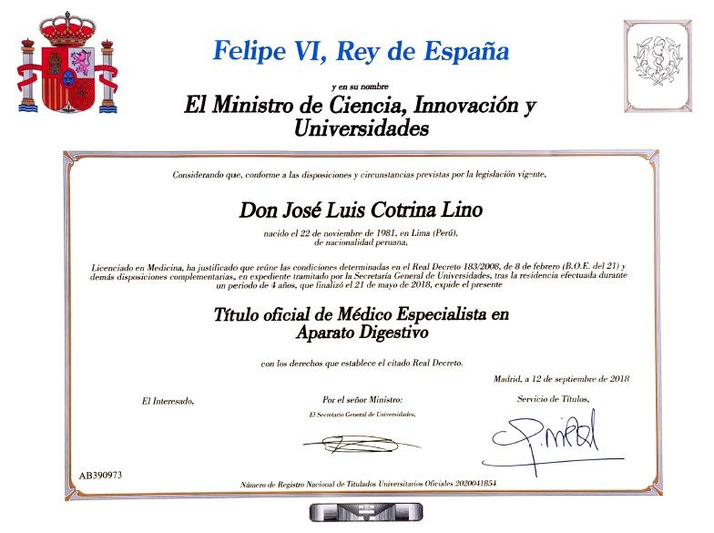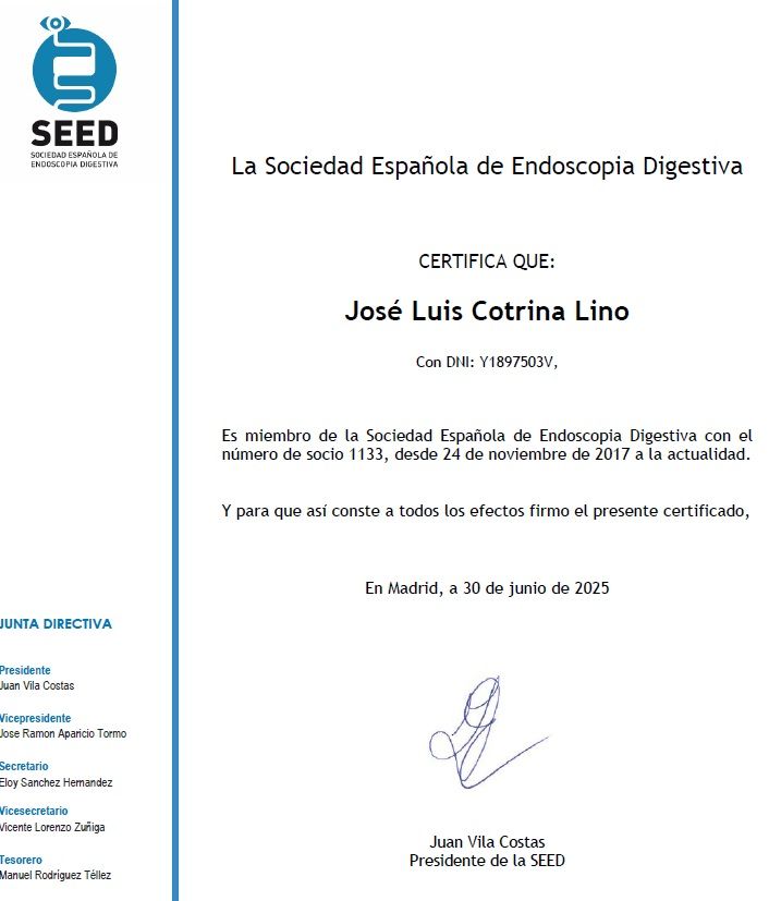 ¿Cuáles son las principales especialidades de José Luis Cotrina Lino?José Luis Cotrina Lino es digestólogo. Te mostramos algunos de los servicios que ofrece gracias a su trayectoria y amplia experiencia: Visita Aparato Digestivo, Cromoendoscopia, Cápsula endoscópica, Macrobiopsia endoscópica, Colocación de balón gástrico, Colocación de banda elástica en esófago, Colocación de prótesis esofágica, Colocación endoscópica de drenaje nasobiliar o nasopancréatico, Colocación endoscópica de sondas, Cribado del cáncer de colon.