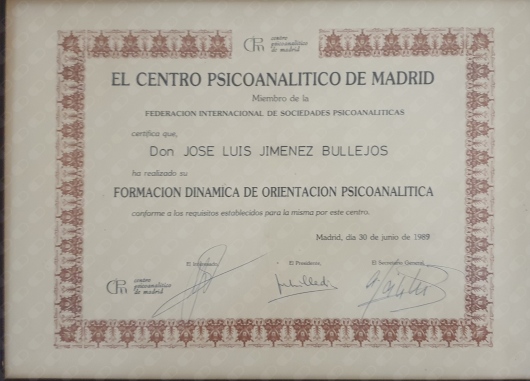 Con el Doctor Don Alejandro Gallego Mere, Miembro de la Federación InternacionalSociedades Psicoanaliticas, además del propio análisis didáctico, tomó contacto en su Centro con experiencias tan enriquecedoras como el Psicodrama Psicoanalitico, otros Grupos, incluyendo, Grupos Balint, Supervisiones con diversos Analistas, además de Seminarios de Autores, Supervisión Grupal de casos continuos, Seminarios de Técnica Psicoanalitica, etc.