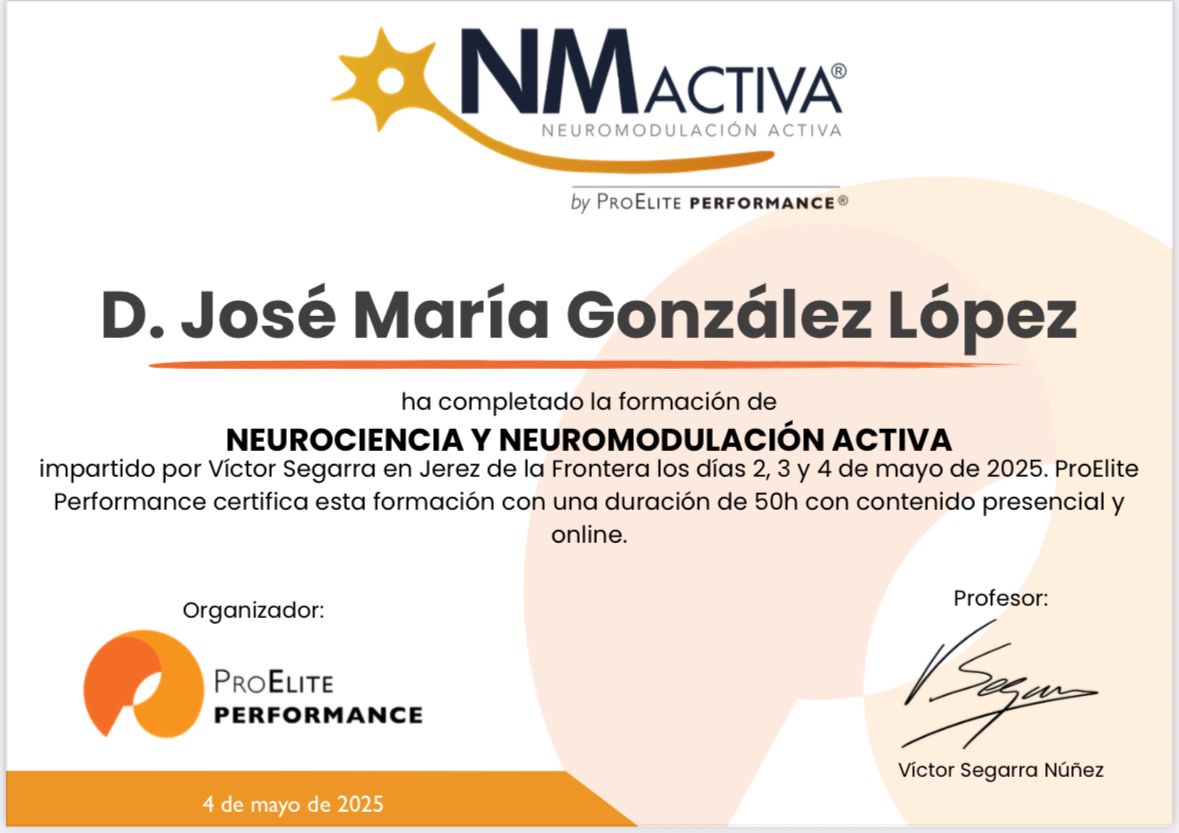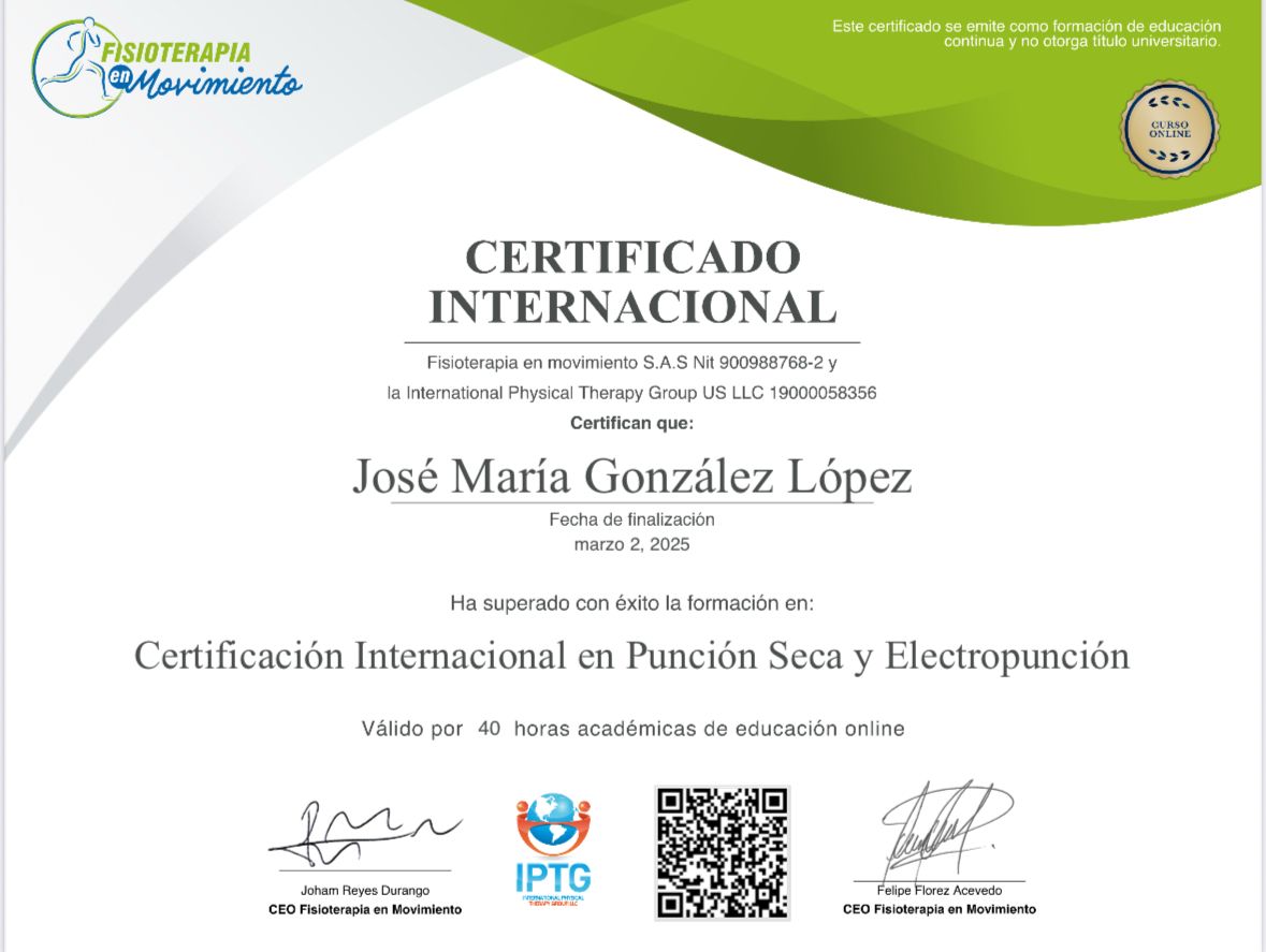 ¿Cuáles son las principales especialidades de José María González López?José María González López es fisioterapeuta. Te mostramos algunos de los servicios que ofrece gracias a su trayectoria y amplia experiencia: Análisis biomecánico del gesto deportivo, Consulta de pacientes con dolor crónico persistente, Ejercicio terapéutico, Electrólisis Percutánea Intratisular (EPI), Fisioterapia neurológica (Ictus, Parkinson, hemiplejias...), Masaje deportivo, Neurodinamia, Neurodinámica, Punción seca, Tratamiento de fascitis plantar.