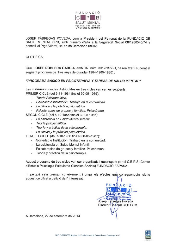 La consulta de Psicología está registrada por el Departamento de Salud de la Generalitat de Cataluña con el Código de Registro de Centros, Servicios y Establecimientos Sanitarios nº E08603376. Cumpliendo así con la normativa exigida por dicho departamento.