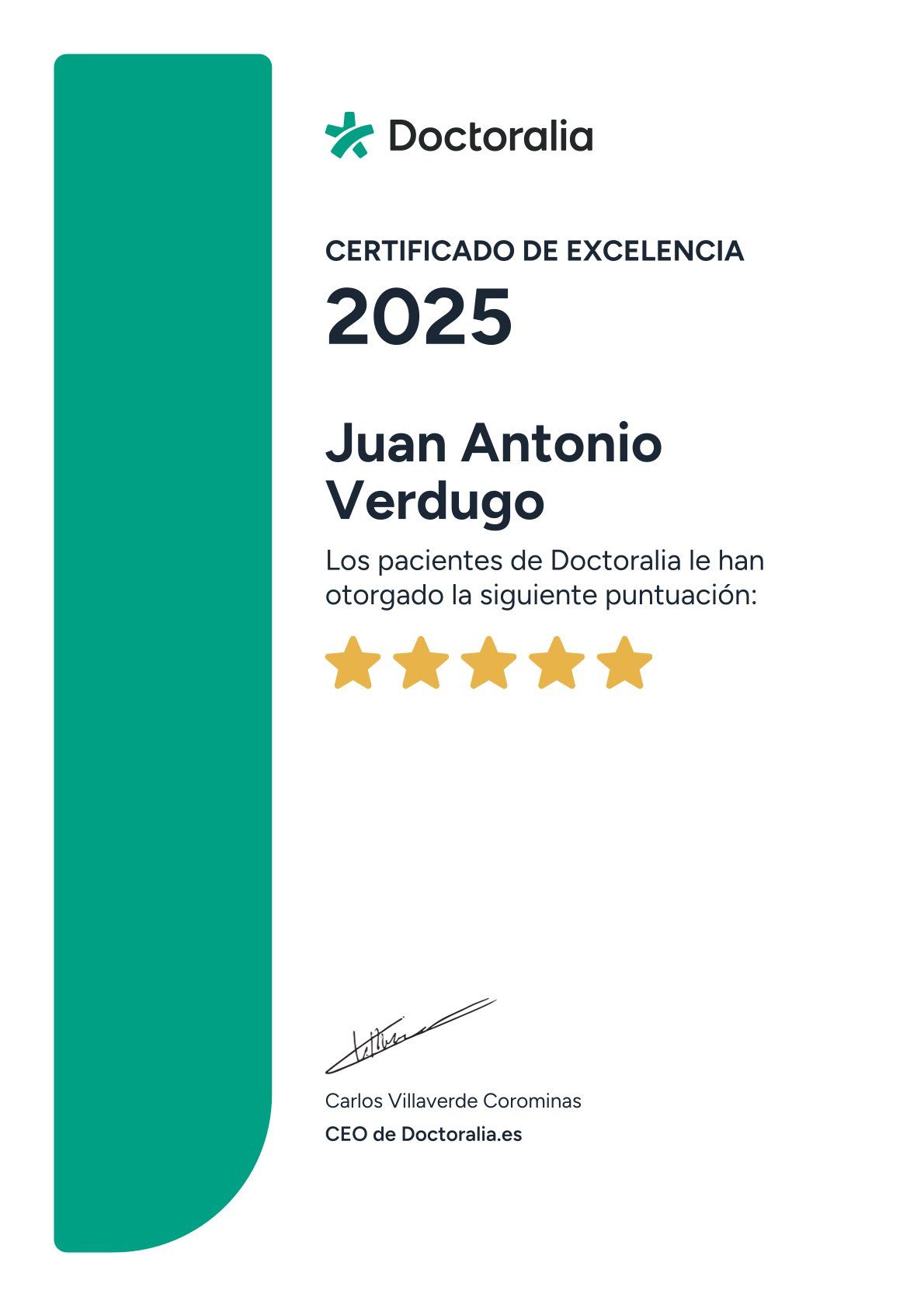 ¿Qué opinan los pacientes de Juan Antonio Verdugo?Un total de 278 pacientes han querido dejar una opinión sincera y real sobre Juan Antonio Verdugo, otorgándole además una valoración media de 5 estrellas (sobre un máximo de 5).