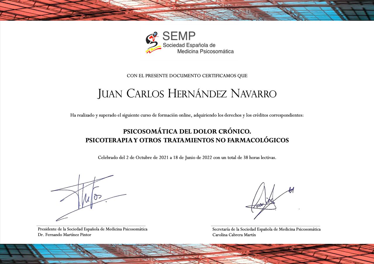¿Cuáles son las principales especialidades de Juan Carlos Hernández Navarro?Juan Carlos Hernández Navarro es psicólogo. Te mostramos algunos de los servicios que ofrece gracias a su trayectoria y amplia experiencia: Primera visita Psicología, Visita de tratamiento, Estimulación cognitiva, Mindfulness, Estrategias terapéuticas en comunicación y habilidades sociales, Consulta de Psicología Sanitaria, Reestructuración cognitiva, Técnicas y estrategias de autoestima, Terapia cognitivo-conductual, Acompañamiento psicológico para el adulto mayor.