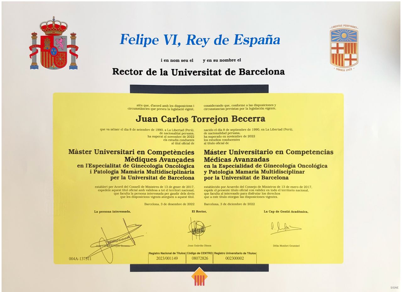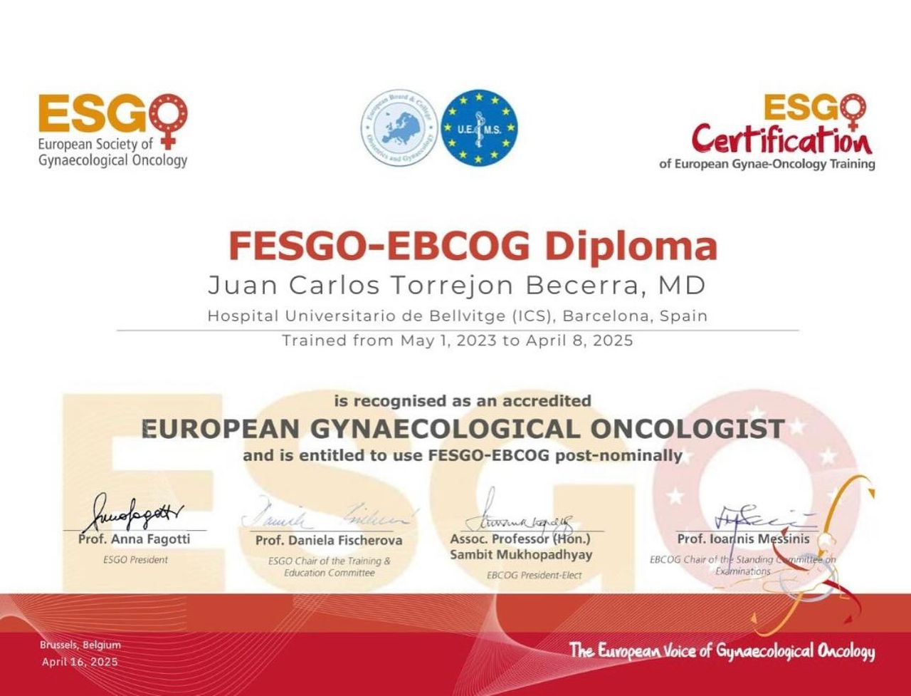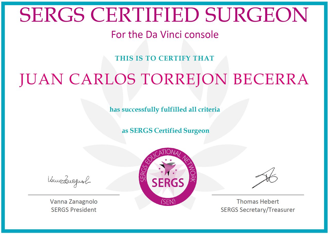 Cuento con formación avanzada en cirugía robótica con el sistema Da Vinci, acreditado por la SERGS (Society of European Robotic Gynaecological Surgery), así como con una subespecialización acreditada por la ESGO (European Society of Gynaecological Oncology), lo que avala mi experiencia en el manejo integral del cáncer ginecológico según los máximos estándares europeos.