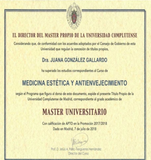 ¿Cuáles son las principales especialidades de Juana Rosa González Gallardo?Juana Rosa González Gallardo es médica estética. Te mostramos algunos de los servicios que ofrece gracias a su trayectoria y amplia experiencia: Análisis facial y de la piel, Aplicación de neurotoxina en arrugas de expresión (entrecejo, frente y patas de gallo), Mesoterapia capilar, Generadores o inductores de colágeno, Infiltración de Hidroxiapatita cálcica, Hidratación profunda Skinbooster, Biorevitalización facial con polinucleótidos polimerizados, Tratamiento corporal, Rejuvenecimiento corporal: cuello, manos y escote, Tratamiento de relleno de labios.