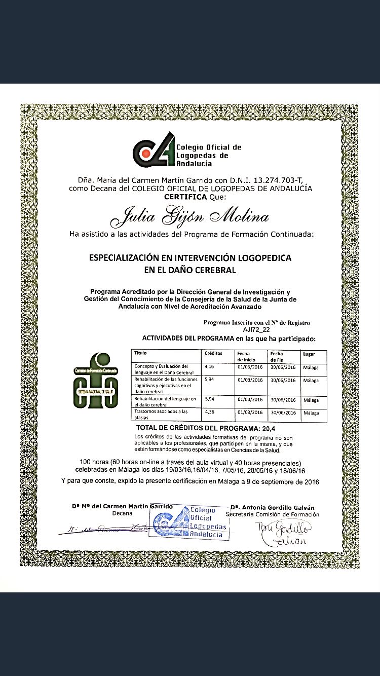Gracias Julia, !!! Nuestra visita fue por posibles problemas en la dicción por otra patología, nos asesoró previamente brutal, hizo que la pequeña estuviera cómoda durante su evaluación y nos dio tratamiento que a la fecha hace que todo vaya mejorando de manera real. Toda una profesional de la logopedia totalmente implicada y recomendable al 100%. GRACIAS