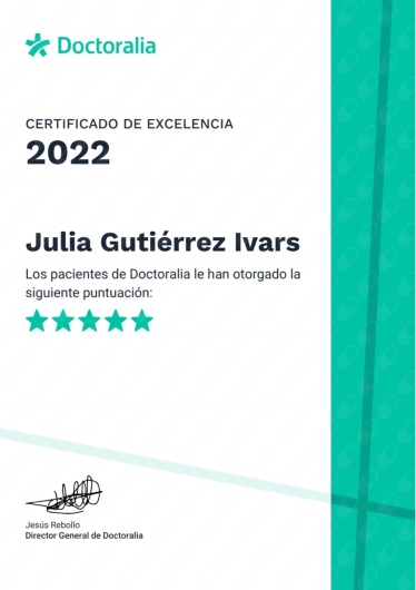 ¿Cómo puedo reservar una cita con Julia Gutiérrez Ivars?El calendario que muestra Julia Gutiérrez Ivars en Doctoralia está actualizado en tiempo real, por lo que solo tienes que elegir qué día y hora te va mejor de entre las disponibles. La reserva es gratuita, y además recibes un recordatorio antes de la visita.
