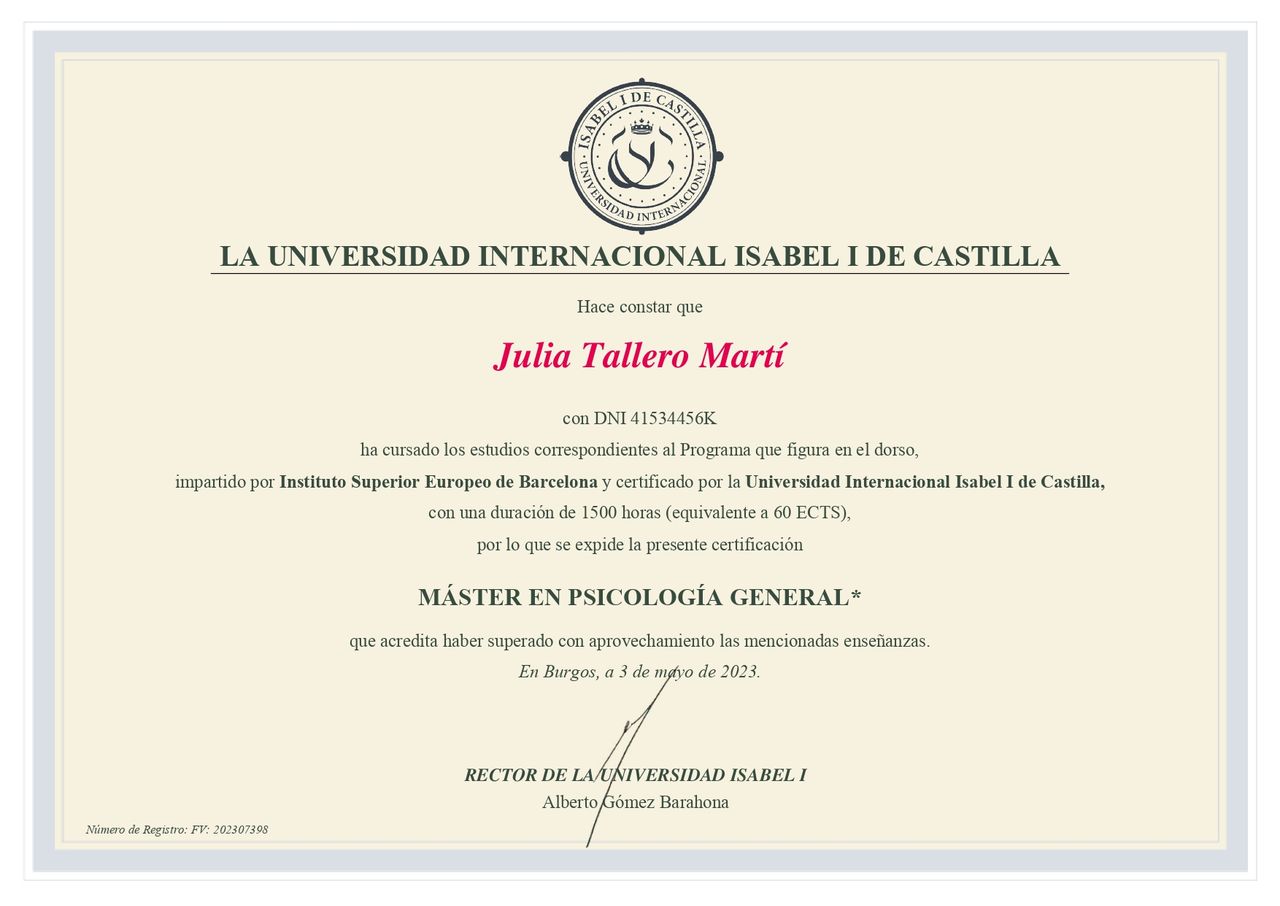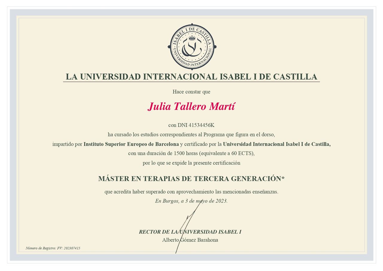 ¿Cuáles son las principales especialidades de Júlia Tallero Martí?Júlia Tallero Martí es psicóloga. Te mostramos algunos de los servicios que ofrece gracias a su trayectoria y amplia experiencia: Consulta online, Psicología online, Consulta psicológica online, Seguimiento online, Psicoterapia online, Videoconsulta online, Terapia online, Asesoría psicológica online, Atención psicológica por videoconferencia, Tratamiento en autoestima.