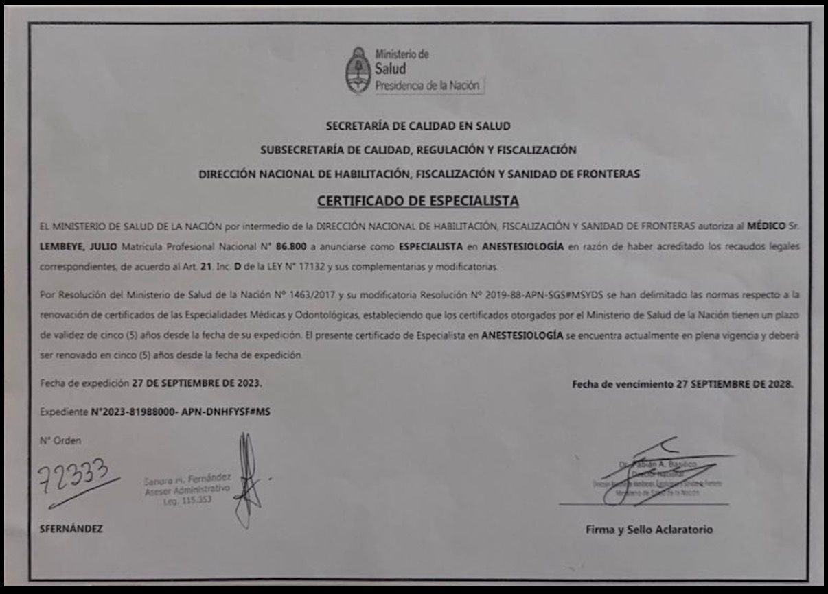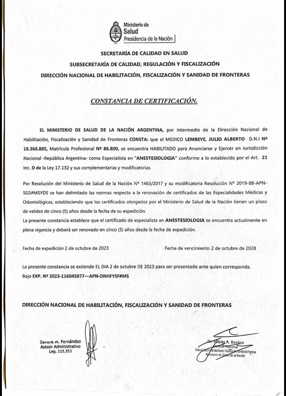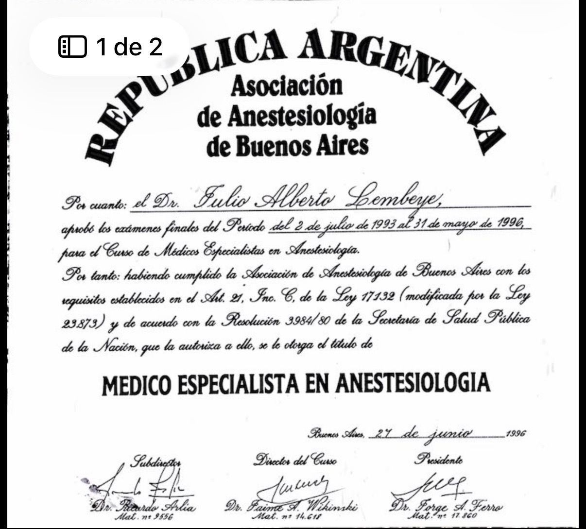 Medico anestesiólogo formado en argentina con subespecialidad en sedación en cardiología intervencionista , anestesia y analgesia en obstetricia , consultorio pre anestésico, y medicina de dolor especialmente en patologías oncológicas . Mi mayor virtud a lo largo de estos 33 años como medico es saber escuchar al paciente y tratar de acompañarlo y aconsejarlo en la sanacion de sus dolencias .