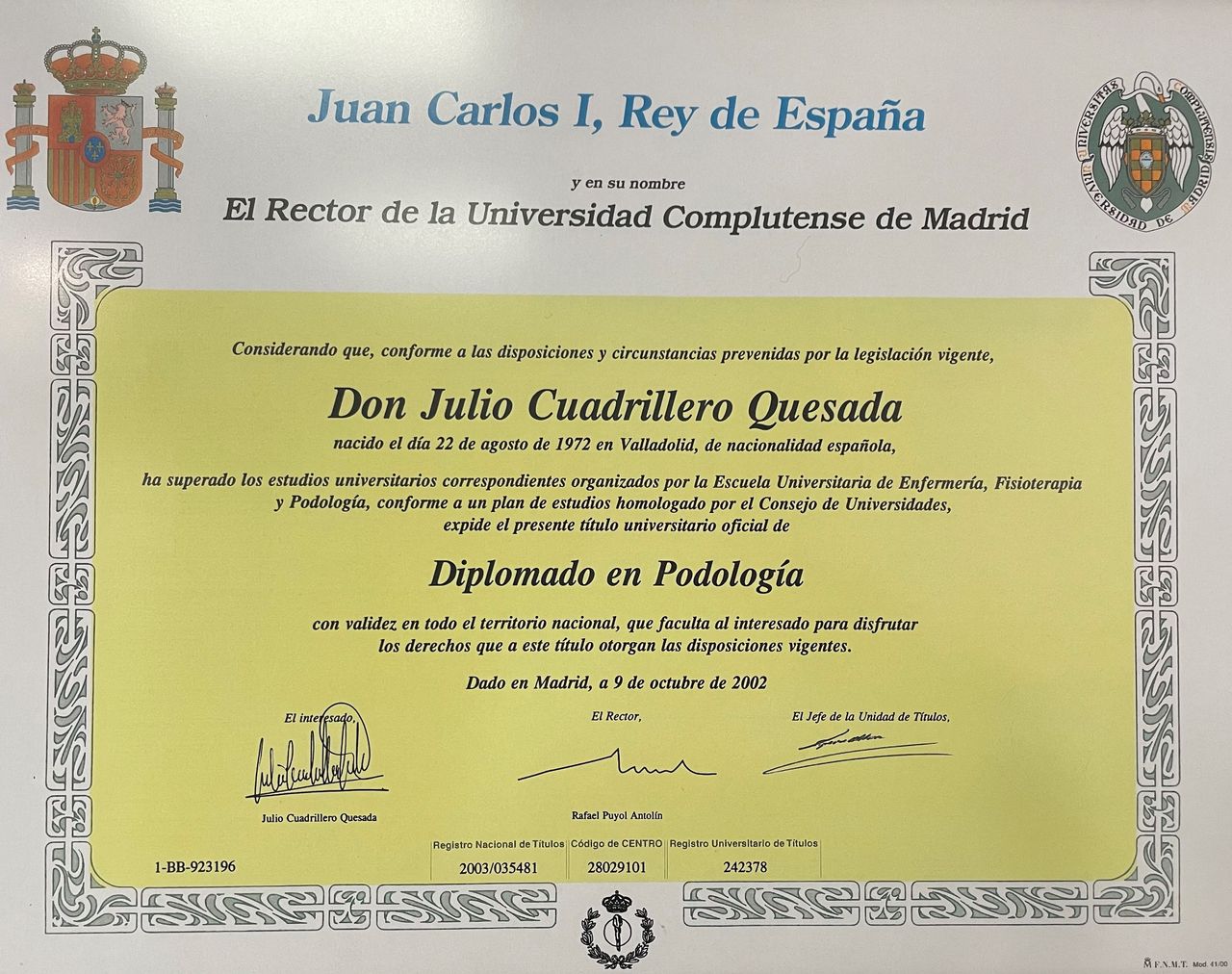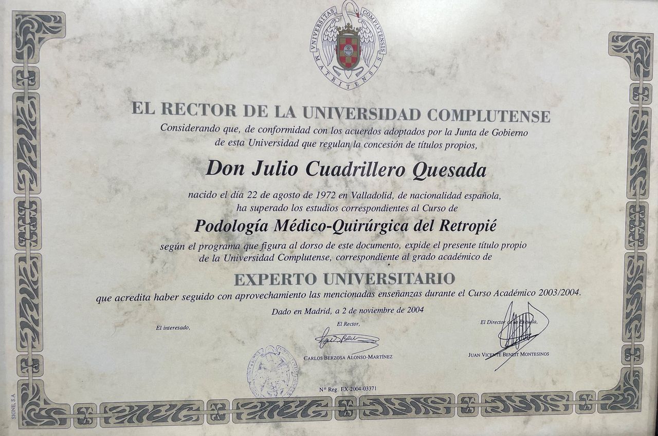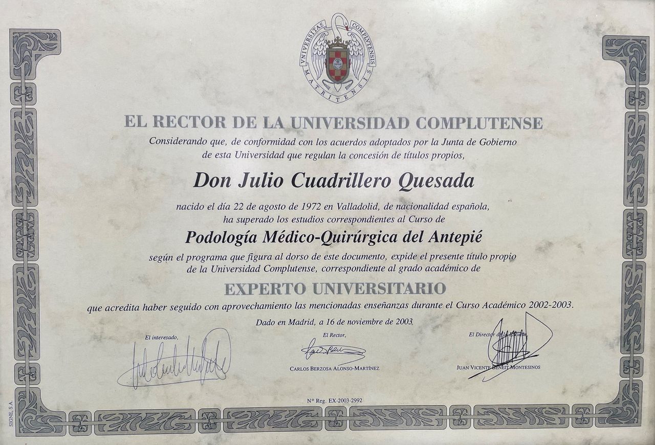 Ldo Medicina y Cirugía Universidad de ValladolidDiplomado Podología Universidad Complutense MadridExperto Universitario Patología Antepié y Retropié