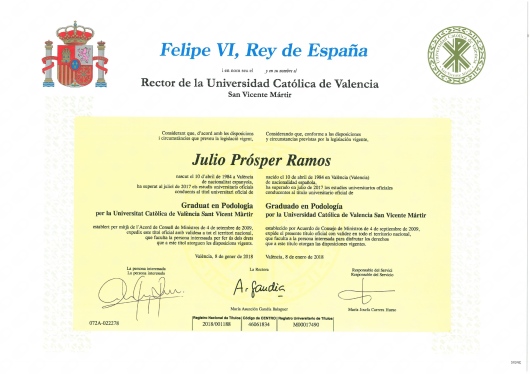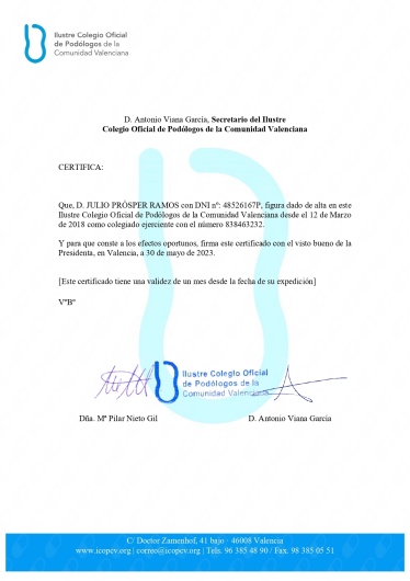 ¿Cuáles son las principales especialidades de Julio Prósper Ramos?Julio Prósper Ramos es podólogo. Te mostramos algunos de los servicios que ofrece gracias a su trayectoria y amplia experiencia: Quiropodia, Exploración biomecánica, Infiltraciones, Cirugía de uña encarnada, Cirugía de juanetes (Hallux valgus), Estudio de la pisada, Tratamiento del papiloma plantar, Estudios Biomecánicos, Extirpación de neuroma de Morton, Tratamiento para onicomicosis (hongos).